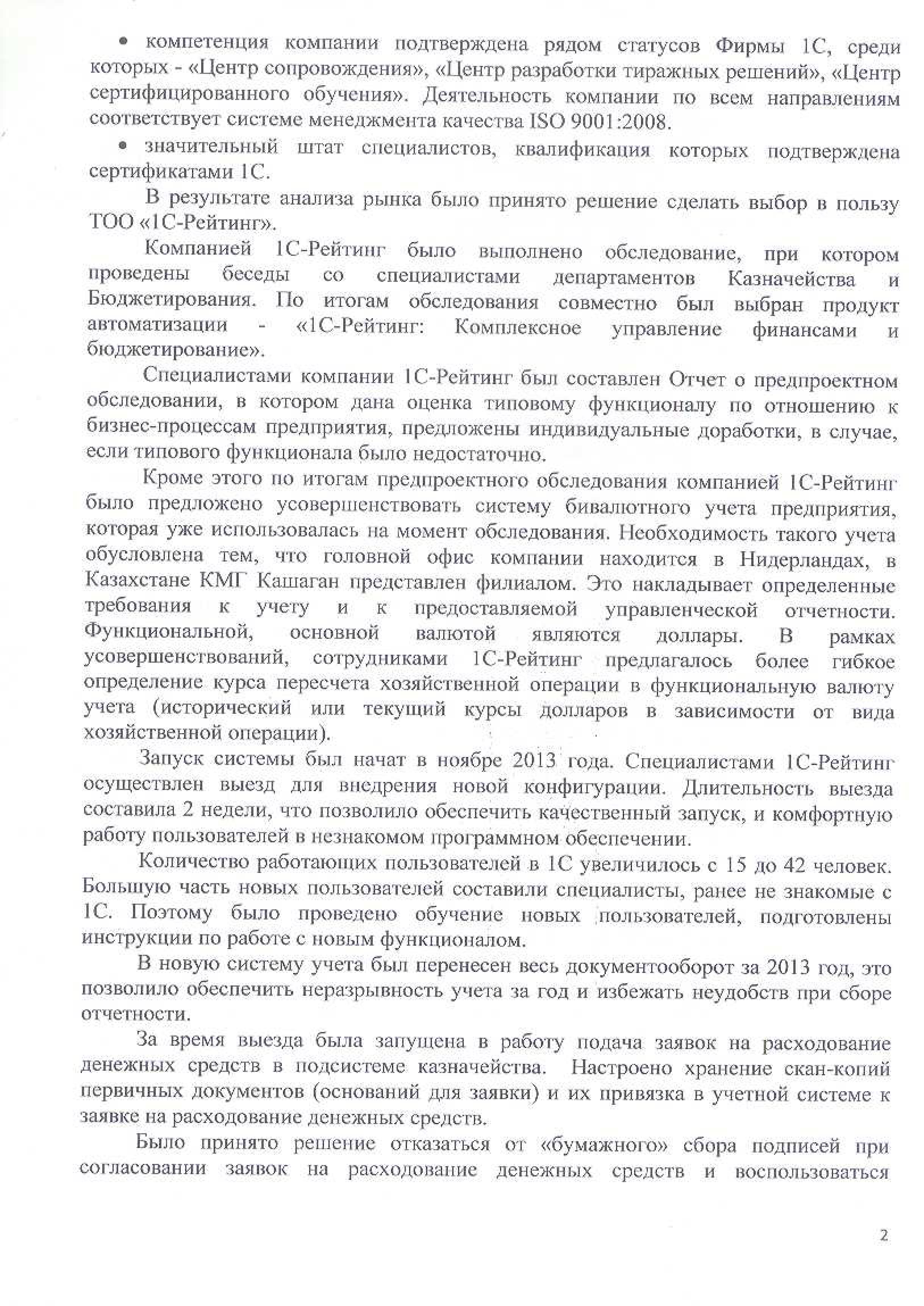 Специалистами компании «1С-Рейтинг» завершен проект автоматизации частной компании с ограниченной ответственностью «КМГ Кашаган Б.В.» с помощью отраслевого решения «1С-Рейтинг: Комплексное управление финансами и бюджетирование для Казахстана». В рамках проекта автоматизированы функции департаментов казначейства и бюджетирования, осуществлено их включение в единую информационную базу. В результате внедрения сокращено время на сбор управленческой отчетности и усилен контроль за финансовой деятельностью предприятия.