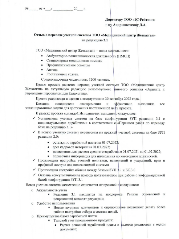 Перевод учетной системы ТОО «Медицинский центр Жезказган» на актуальную редакцию 3.1 используемого типового решения «Зарплата и управление персоналом для Казахстана».Команда исполнителя своевременно и эффективно выполнила все запланированные задачи для достижения поставленной цели проекта.