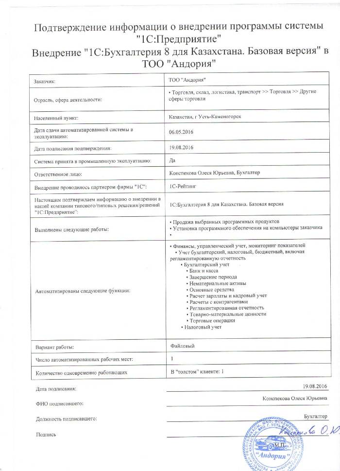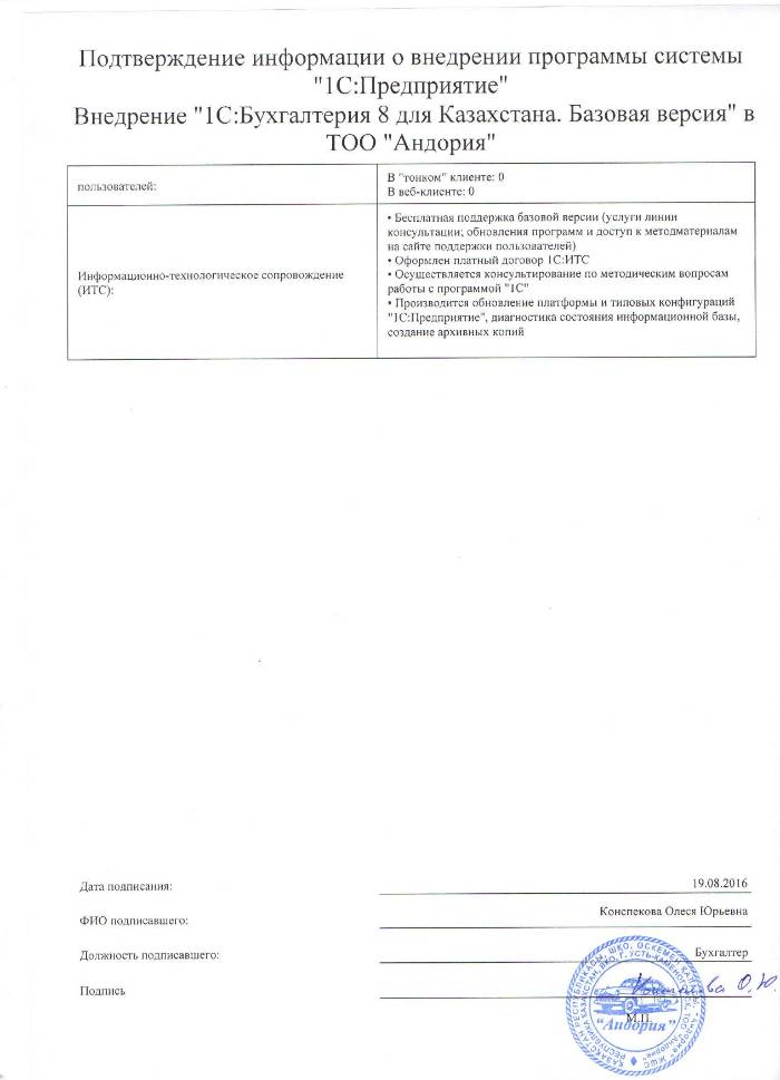 | Внедренное типовое решение: | 1С:Бухгалтерия 8 для Казахстана. Базовая версия |