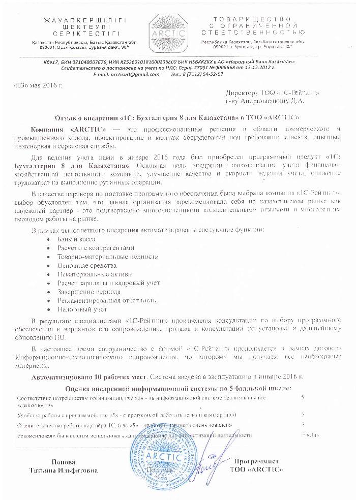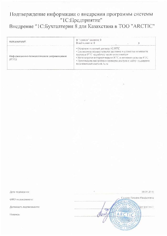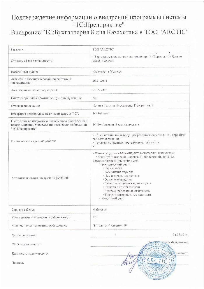 | Внедренное типовое решение: | 1С:Бухгалтерия 8 для Казахстана |