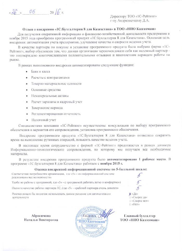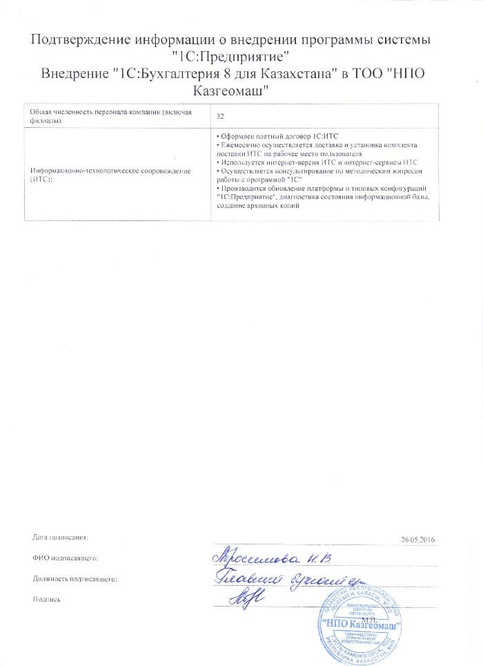| Внедренное типовое решение: | 1С:Бухгалтерия 8 для Казахстана |