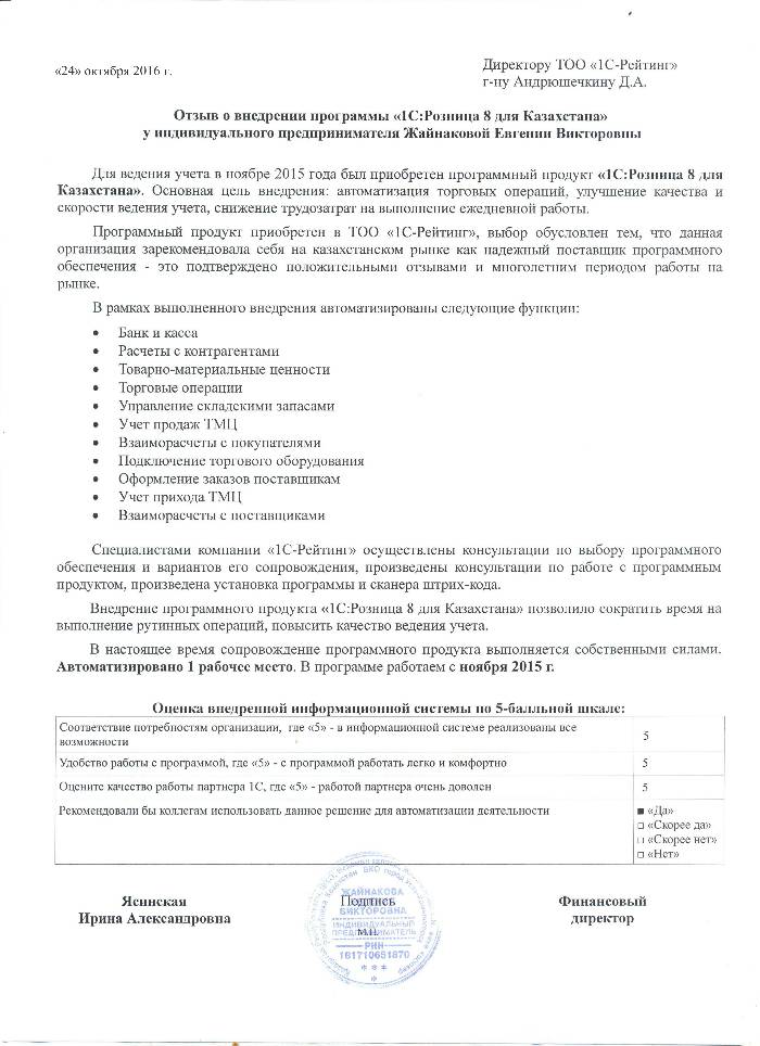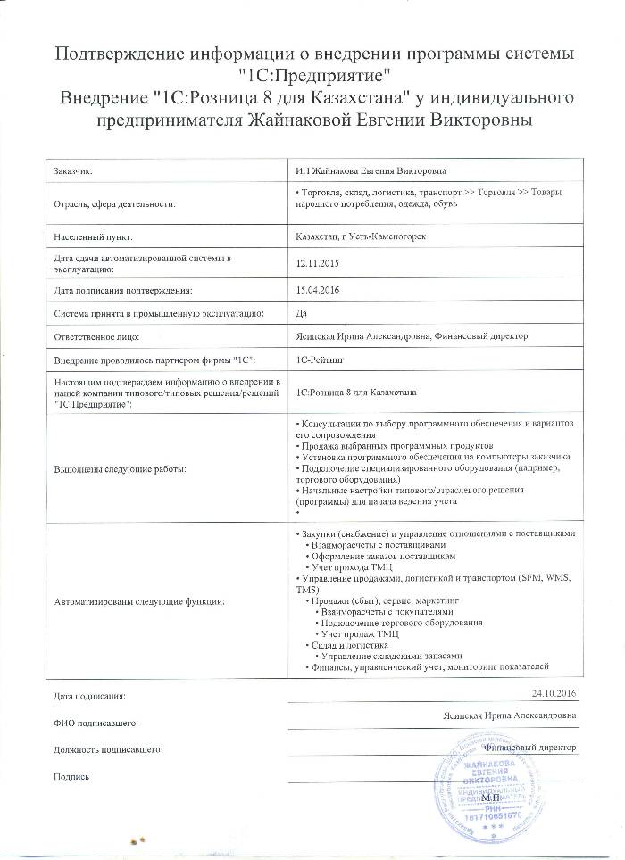 | Внедренное типовое решение: | 1С:Розница 8 для Казахстан |