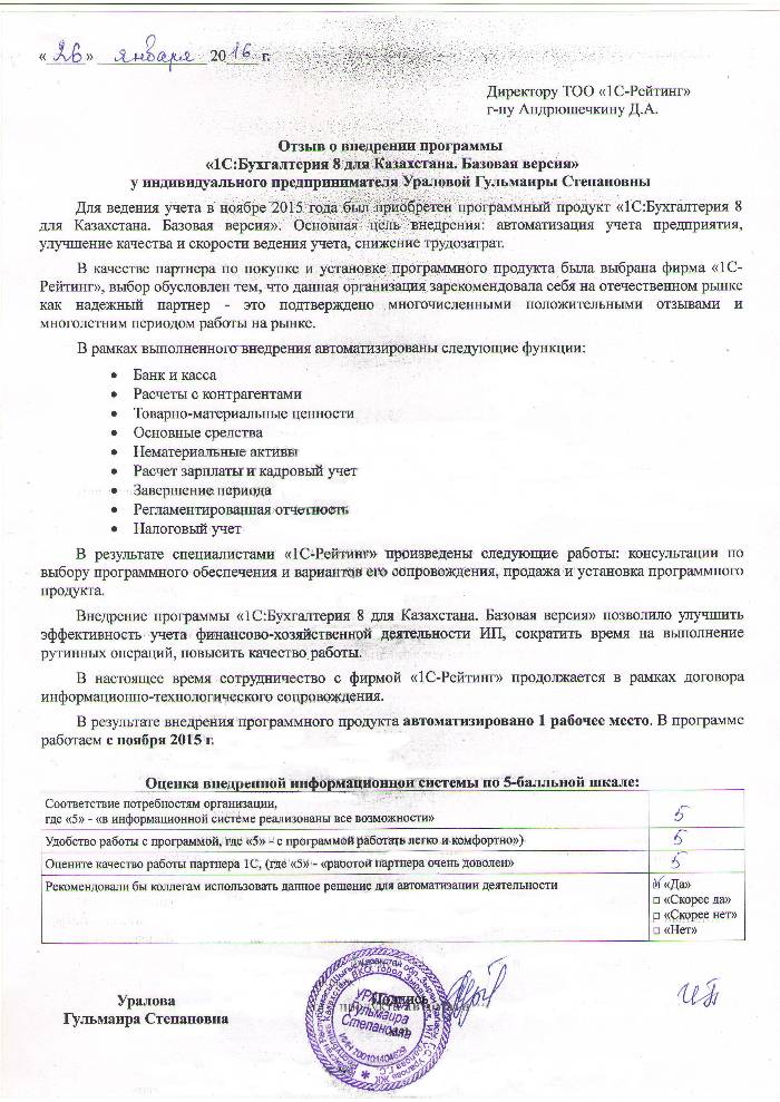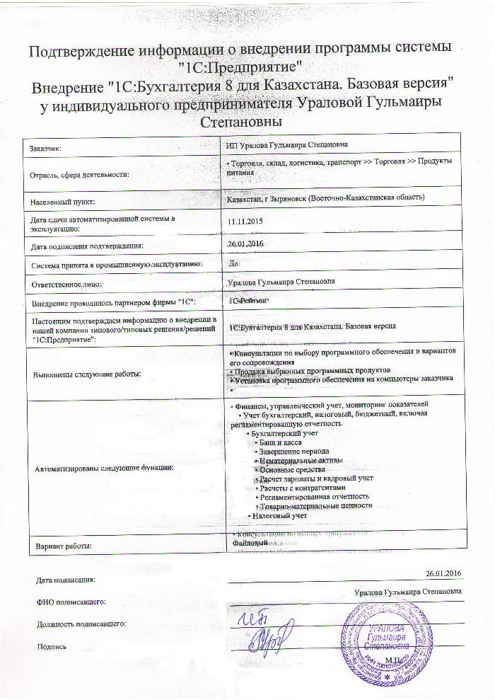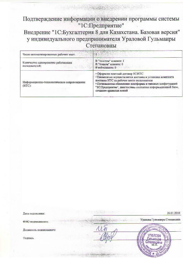 Внедрение 1С:Бухгалтерия 8 для Казахстана. Базовая версия у индивидуального предпринимателя Ураловой Гульмаиры Степановны