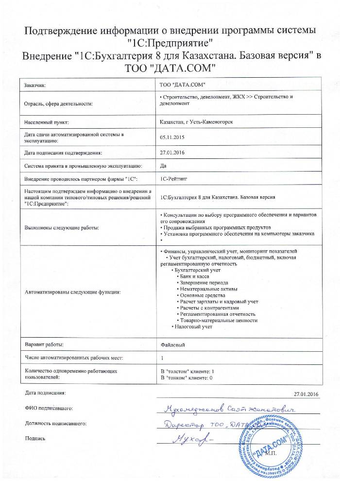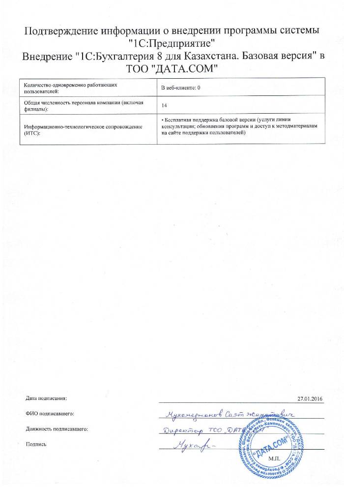 | Внедренное типовое решение: | 1С:Бухгалтерия 8 для Казахстана. Базовая версия |