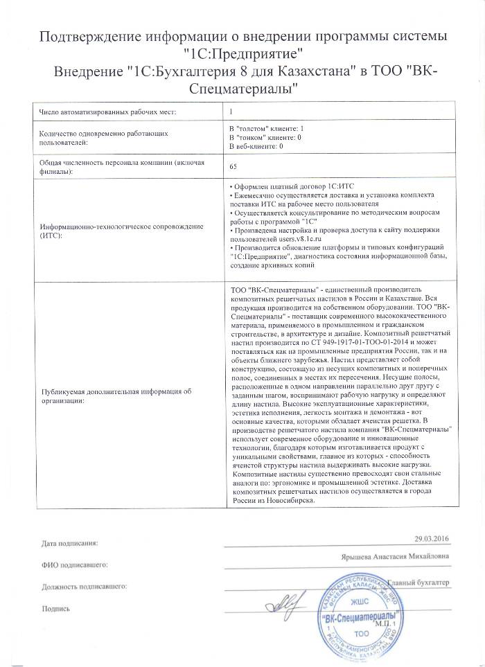 | Внедренное типовое решение: | 1С:Бухгалтерия 8 для Казахстана |