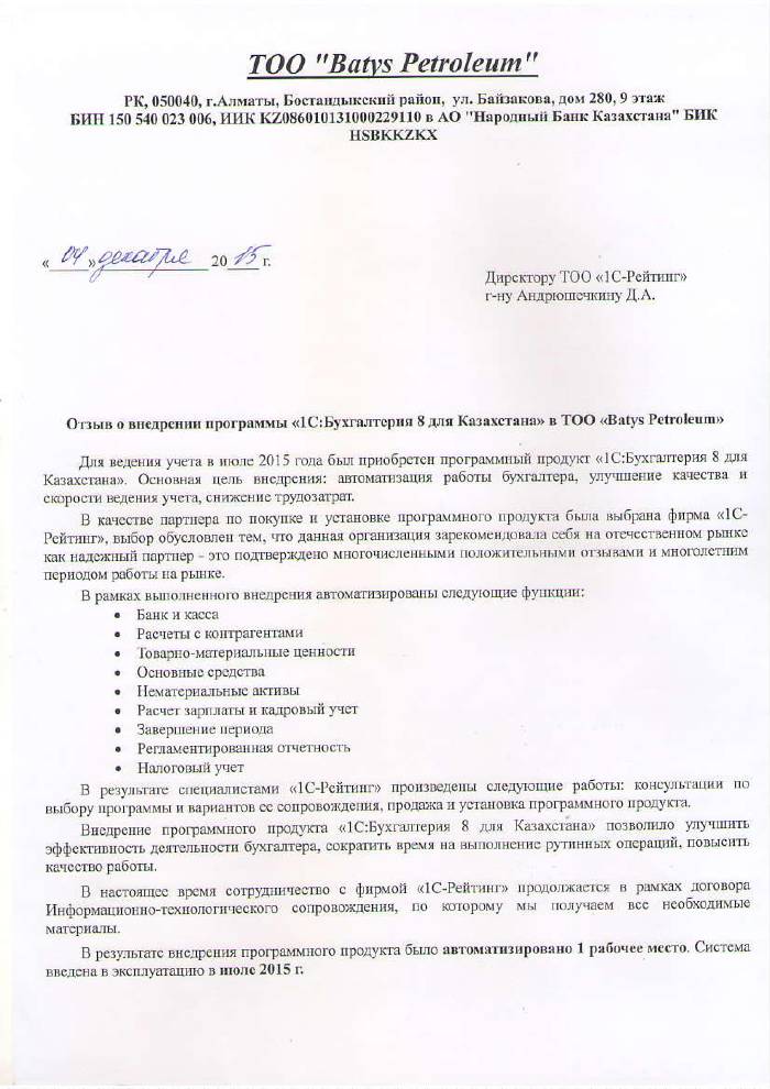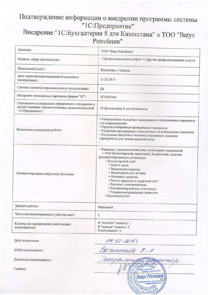 | Внедренное типовое решение: | 1С:Бухгалтерия 8 для Казахстана |