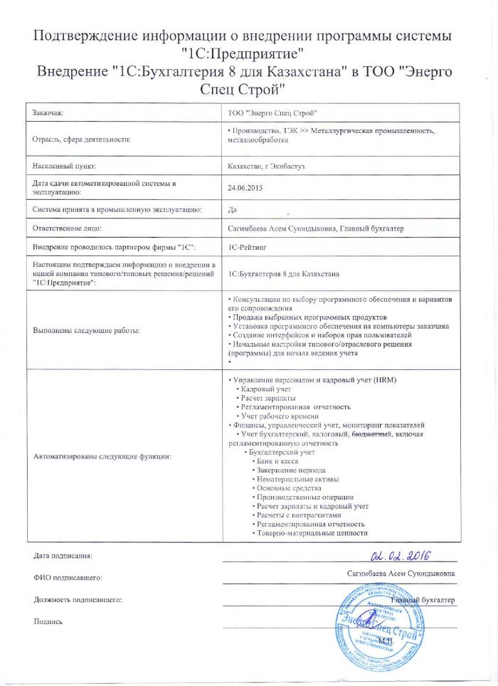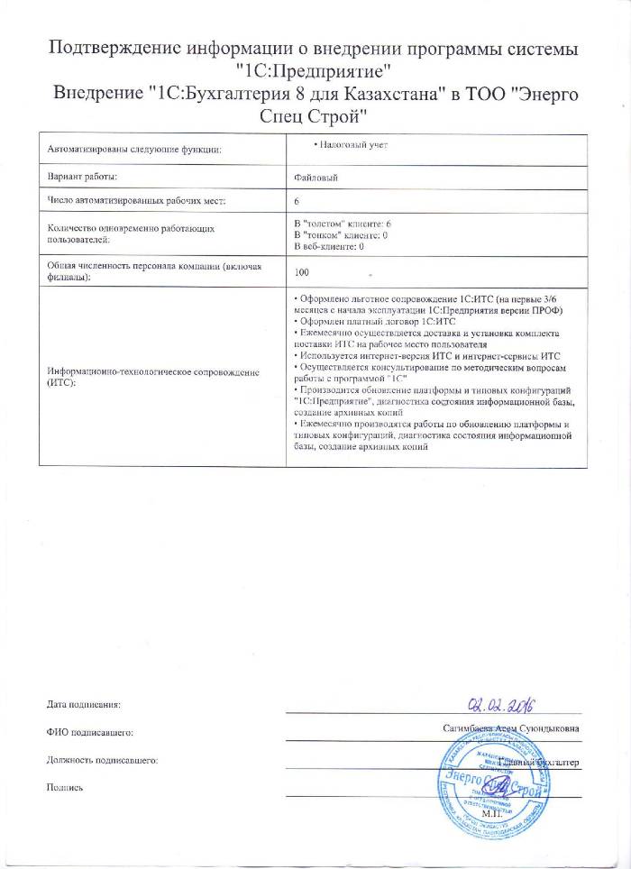 | Внедренное типовое решение: | 1С:Бухгалтерия 8 для Казахстана |