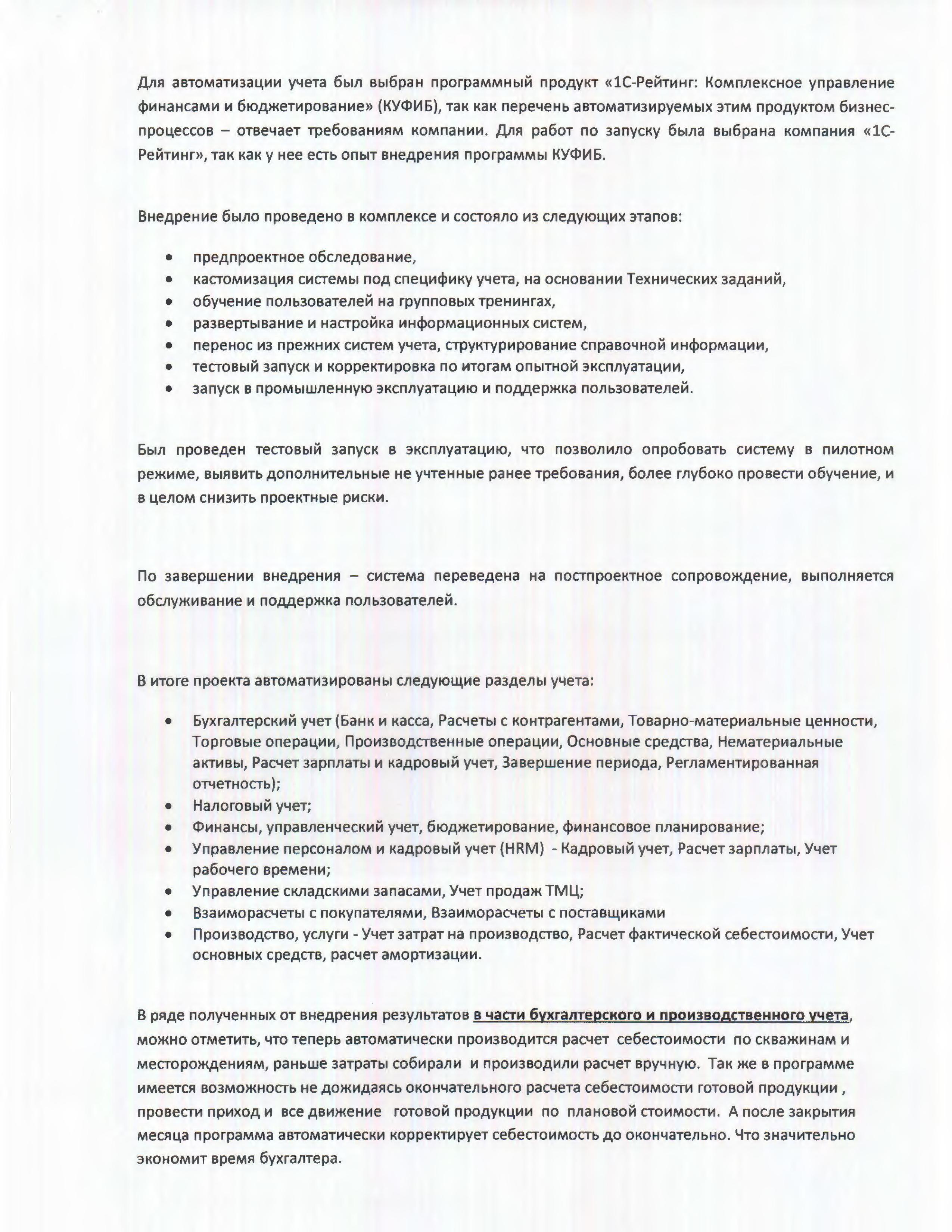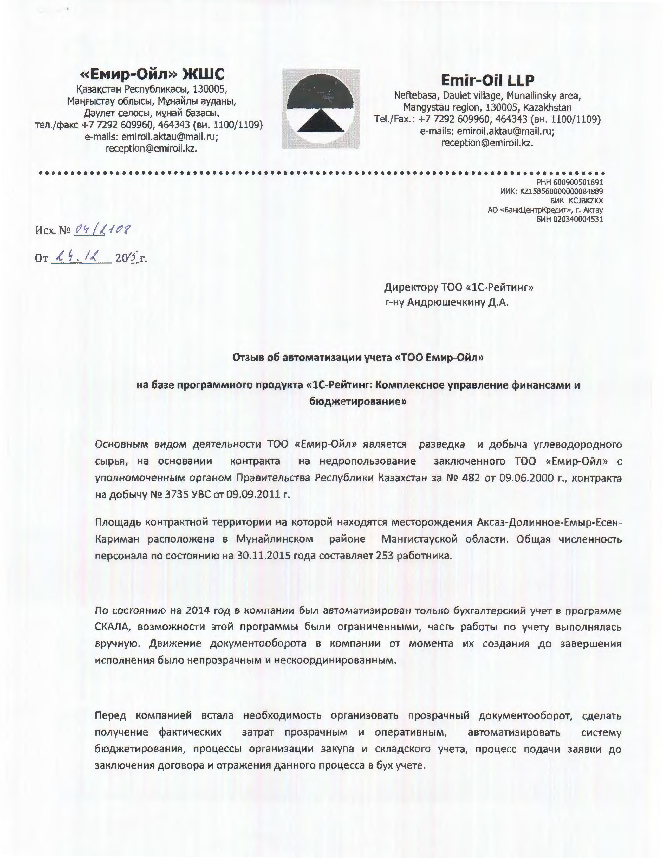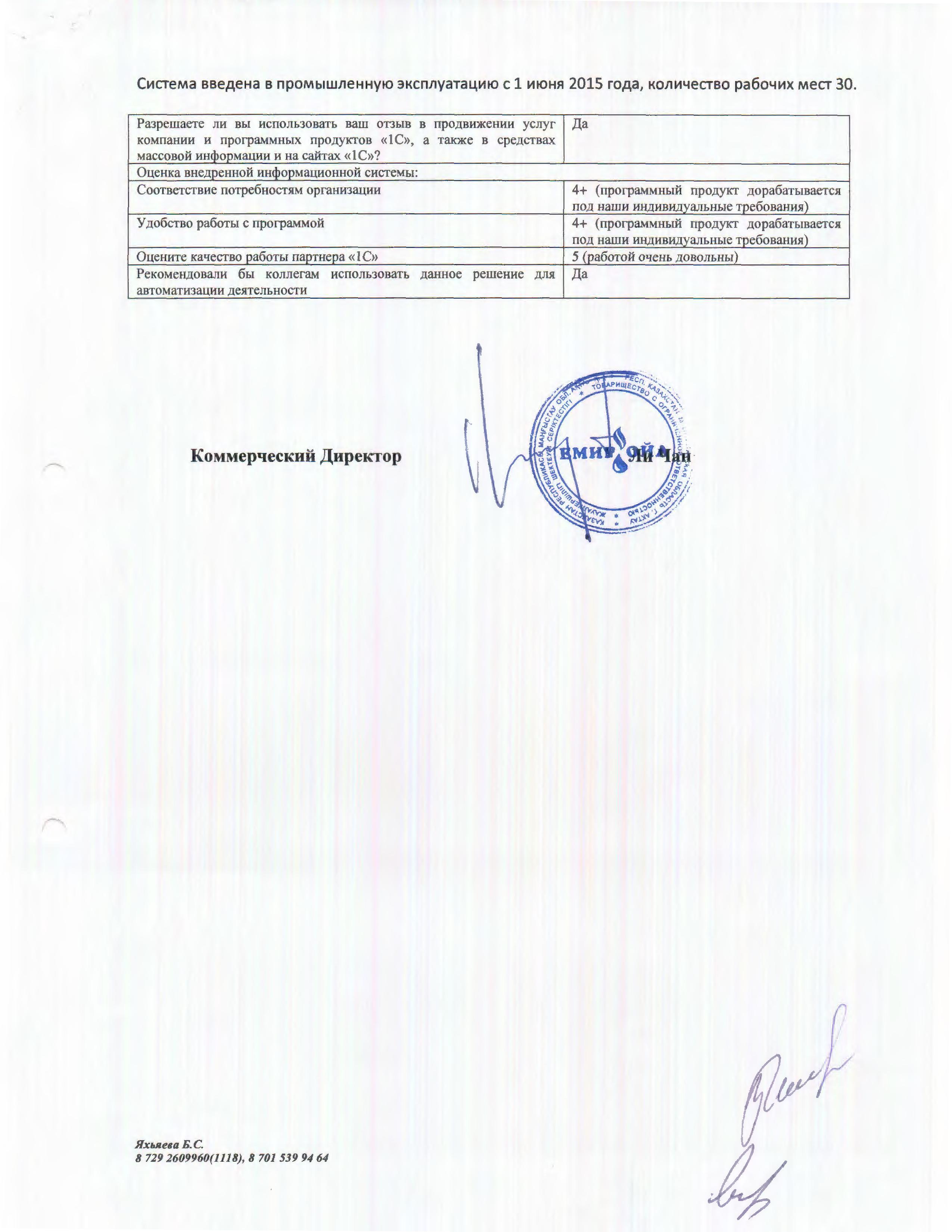 Отзыв начальника департамента экономики, бюджетного планирования, Батимы Яхъяевой: «В процессе внедрения возникало и успешно решалось очень много трудностей, связанных с учетом специфики бюджета компании. Уверена в плодотворной дальнейшей работе с вашей командой».