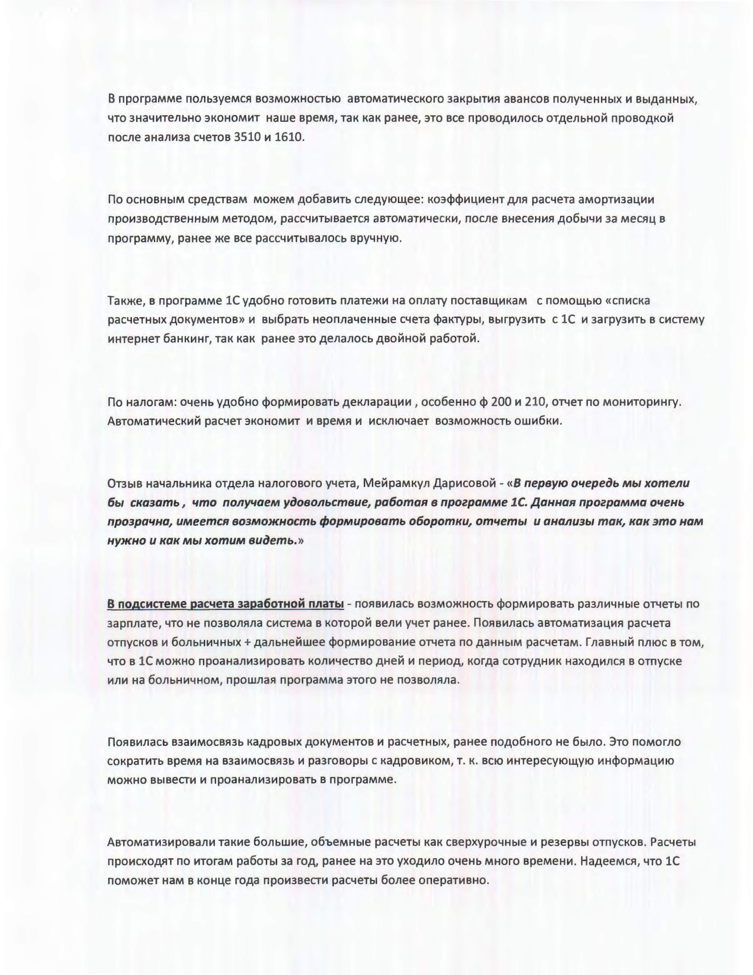 Отзыв начальника отдела налогового учета, Мейрамкул Дарисовой: «В первую очередь мы хотели бы сказать, что получаем удовольствие, работая в программе 1С. Данная программа очень прозрачна, имеется возможность формировать оборотки, отчеты и анализы так, как это нам нужно и как мы хотим видеть».
