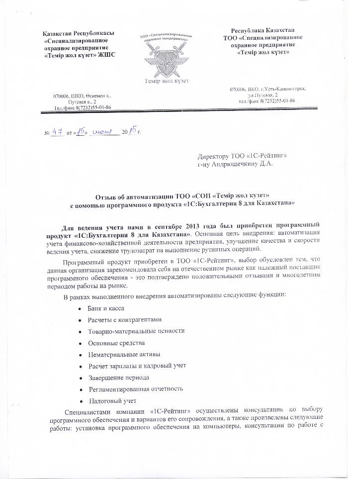 | Внедренное типовое решение: | 1С:Бухгалтерия 8 для Казахстана |