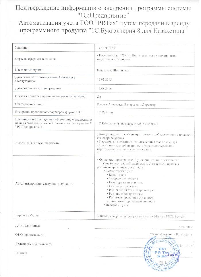 Автоматизация учета ТОО PRTex путем передачи в аренду программного продукта 1С:Бухгалтерия для Казахстана