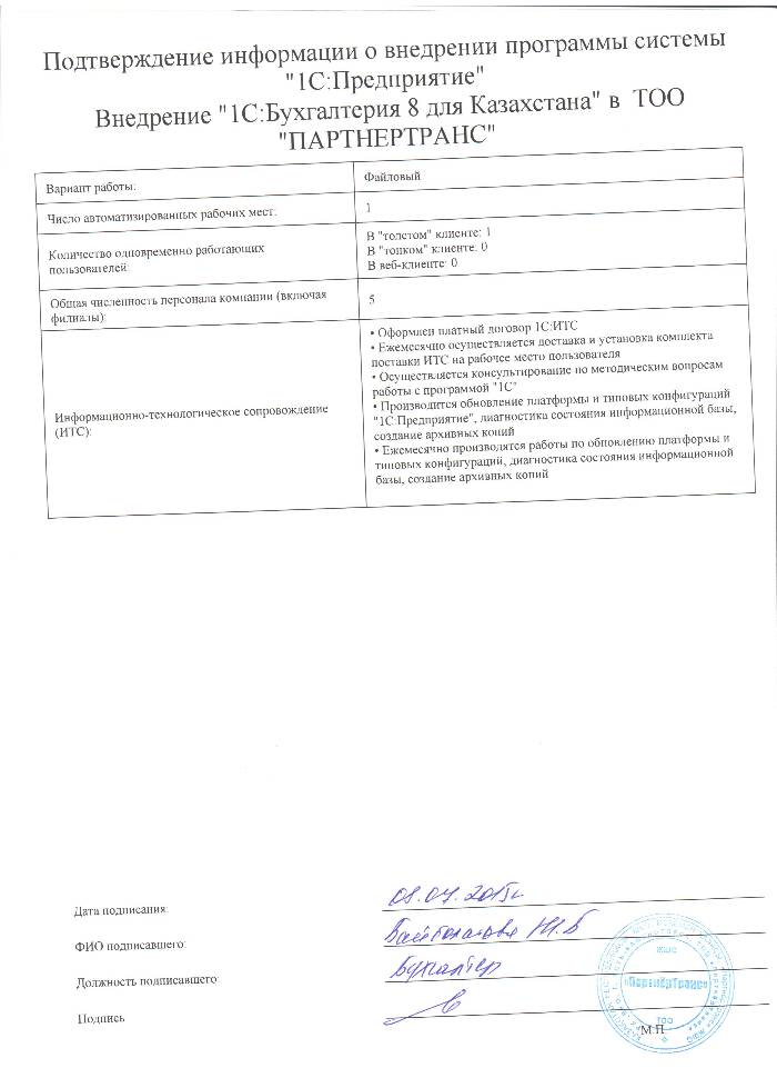 | Внедренное типовое решение: | 1С:Бухгалтерия 8 для Казахстана |