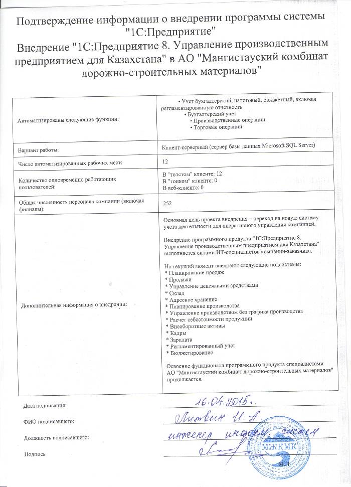 | Внедренное типовое решение: | 1С:Управление производственным предприятием для Казахстана |