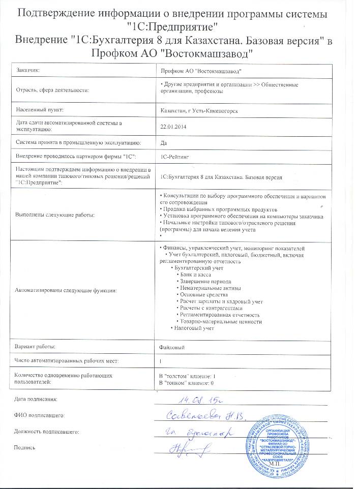 | Внедренное типовое решение: | 1С:Бухгалтерия 8 для Казахстана. Базовая версия |