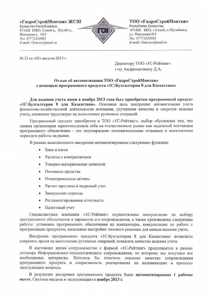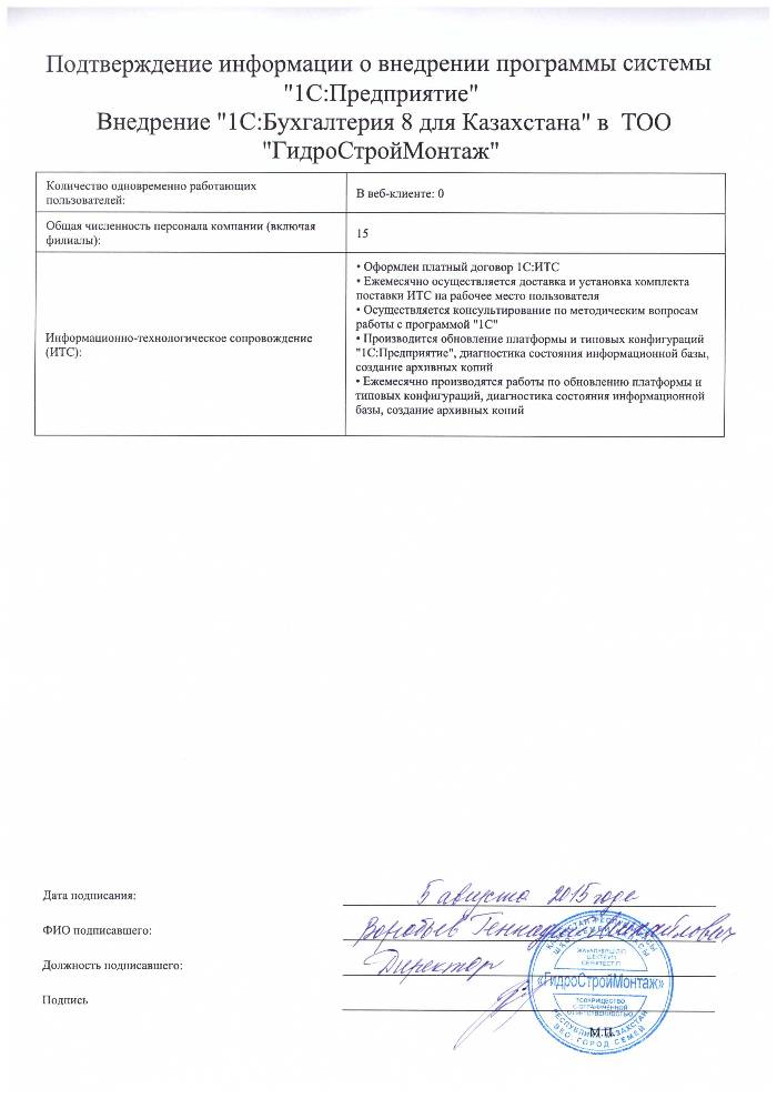 | Внедренное типовое решение: | 1С:Бухгалтерия 8 для Казахстана |
