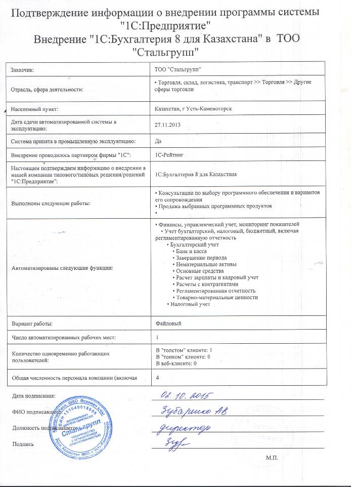| Внедренное типовое решение: | 1С:Бухгалтерия 8 для Казахстана |