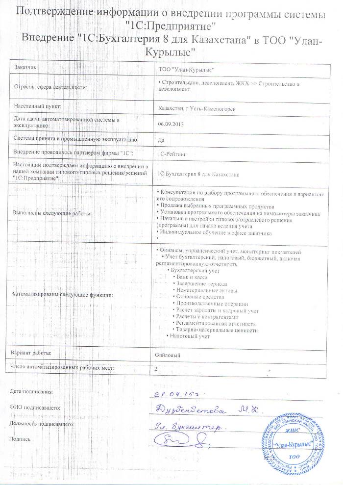 | Внедренное типовое решение: | 1С:Бухгалтерия 8 для Казахстана |