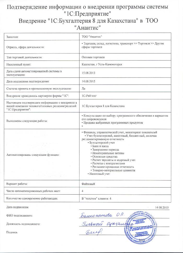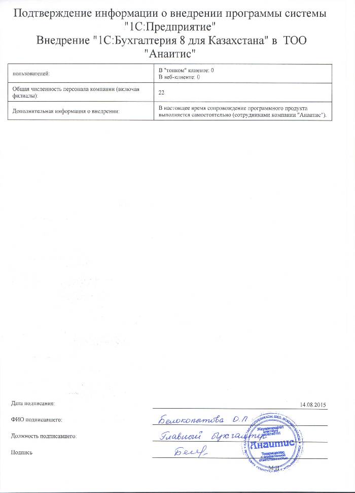 | Внедренное типовое решение: | 1С:Бухгалтерия 8 для Казахстана |