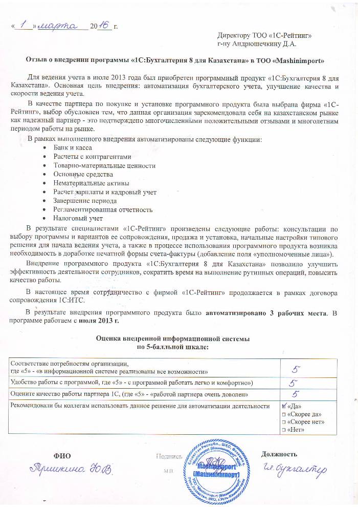 | Внедренное типовое решение: | 1С:Бухгалтерия 8 для Казахстана |
