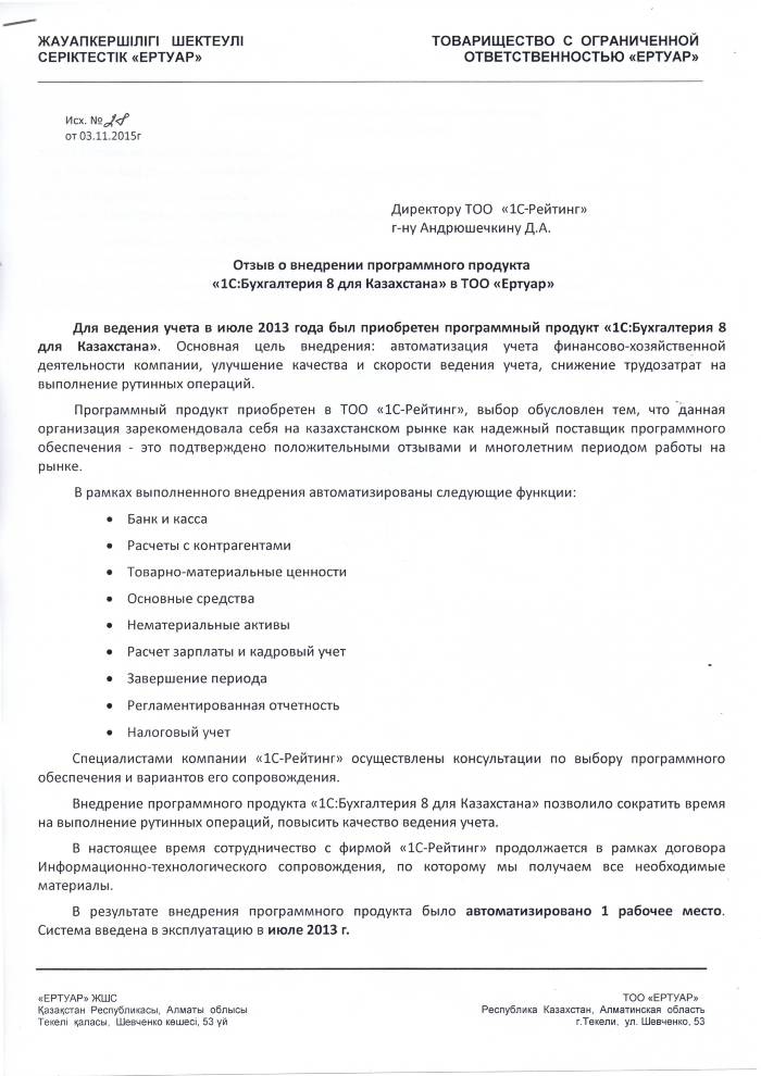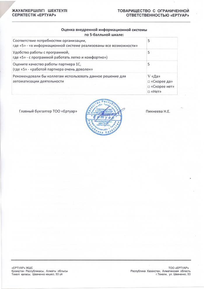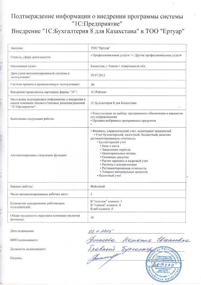 | Внедренное типовое решение: | 1С:Бухгалтерия 8 для Казахстана |