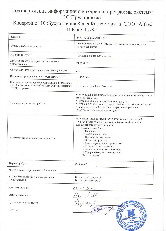 | Внедренное типовое решение: | 1С:Бухгалтерия 8 для Казахстана |