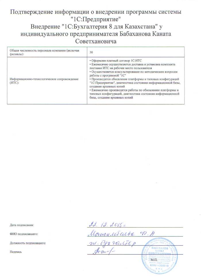 | Внедренное типовое решение: | 1С:Бухгалтерия 8 для Казахстана |