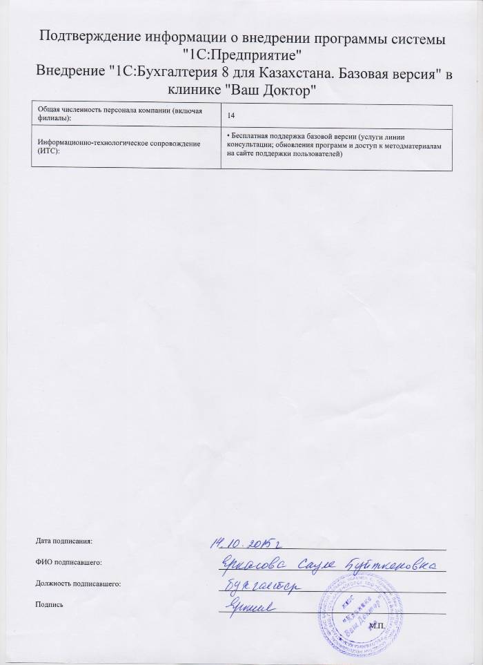 | Внедренное типовое решение: | 1С:Бухгалтерия 8 для Казахстана. Базовая версия |