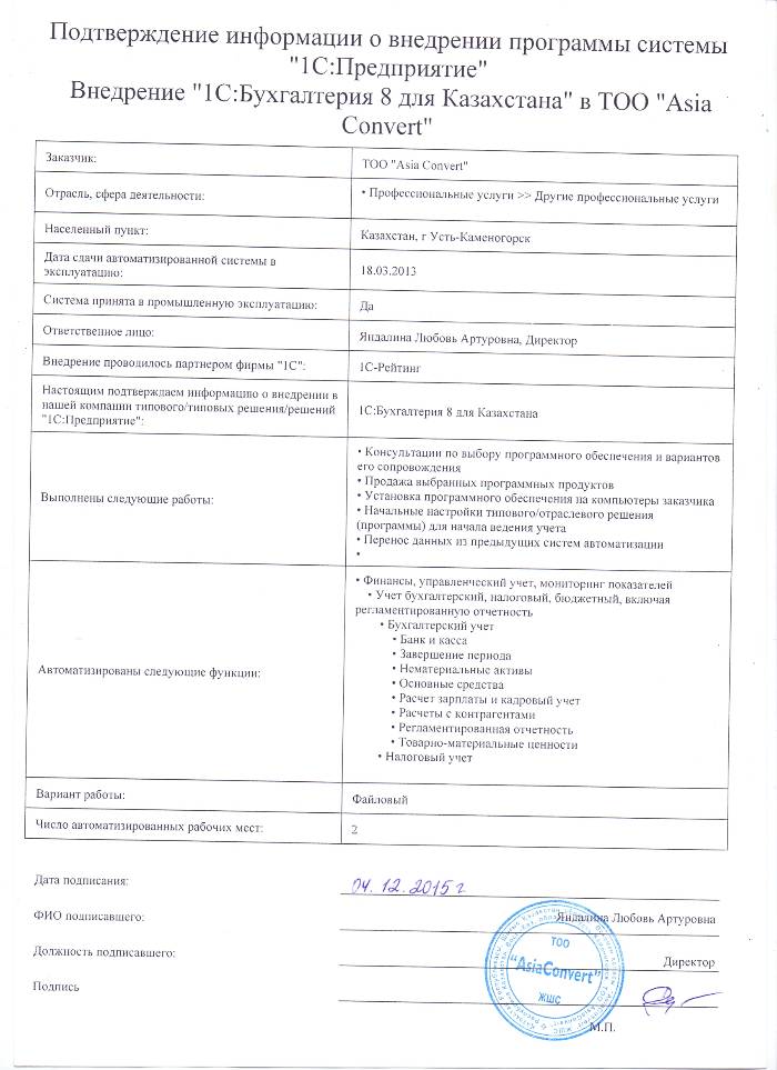 | Внедренное типовое решение: | 1С:Бухгалтерия 8 для Казахстана |