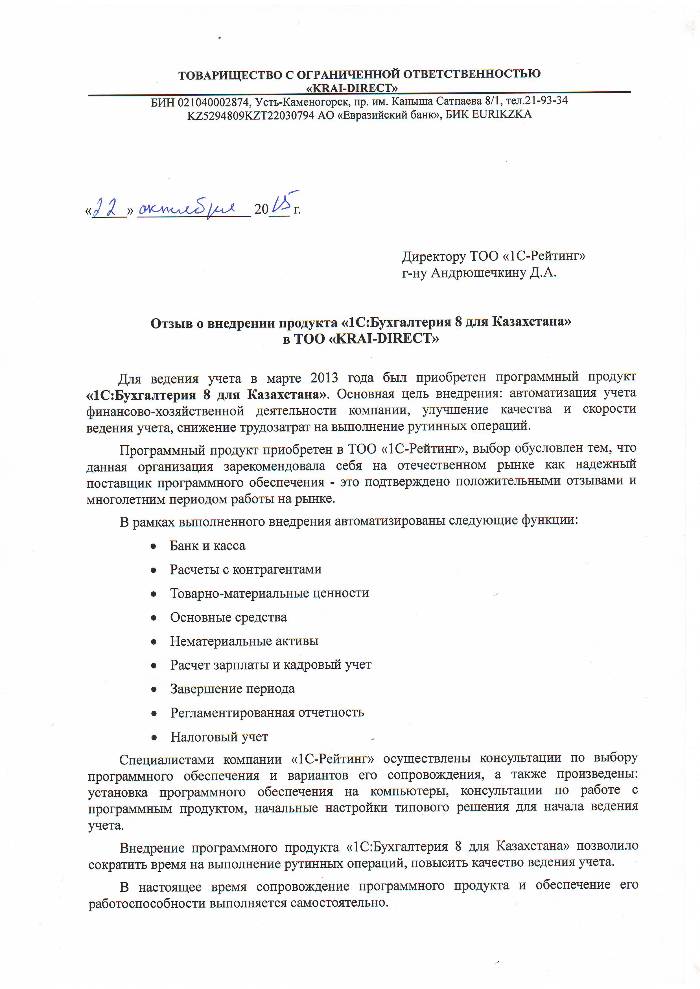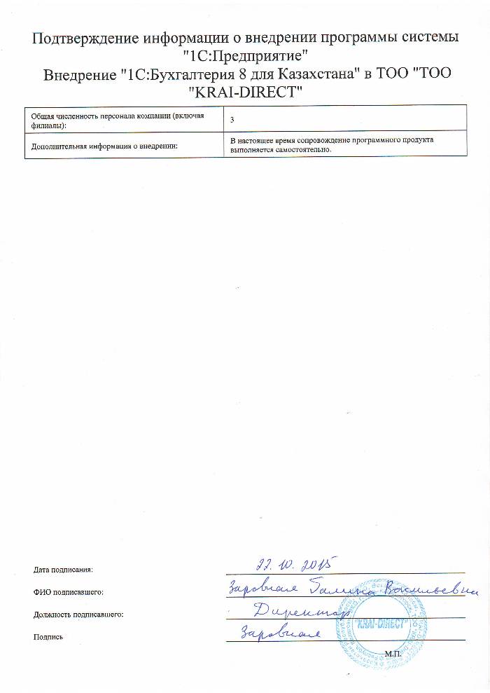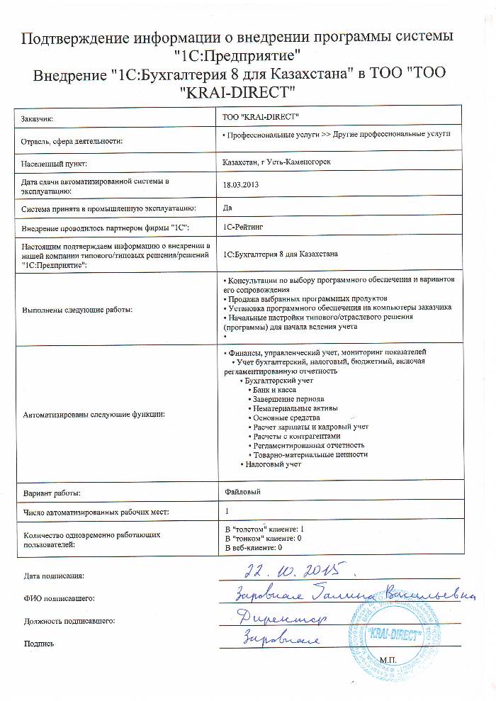| Внедренное типовое решение: | 1С:Бухгалтерия 8 для Казахстана |