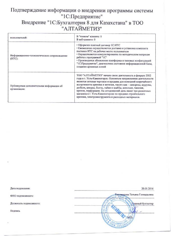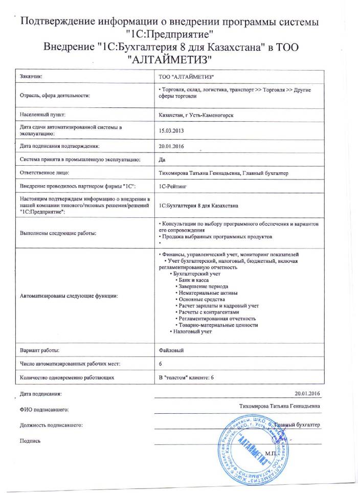 | Внедренное типовое решение: | 1С:Бухгалтерия 8 для Казахстана |