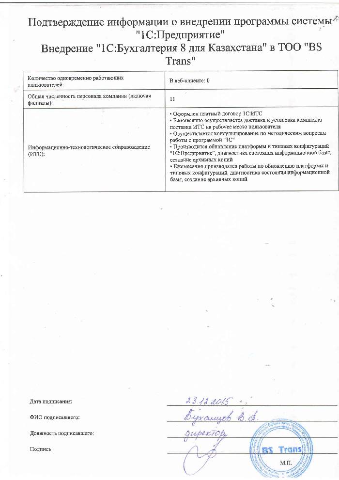 | Внедренное типовое решение: | 1С:Бухгалтерия 8 для Казахстана |