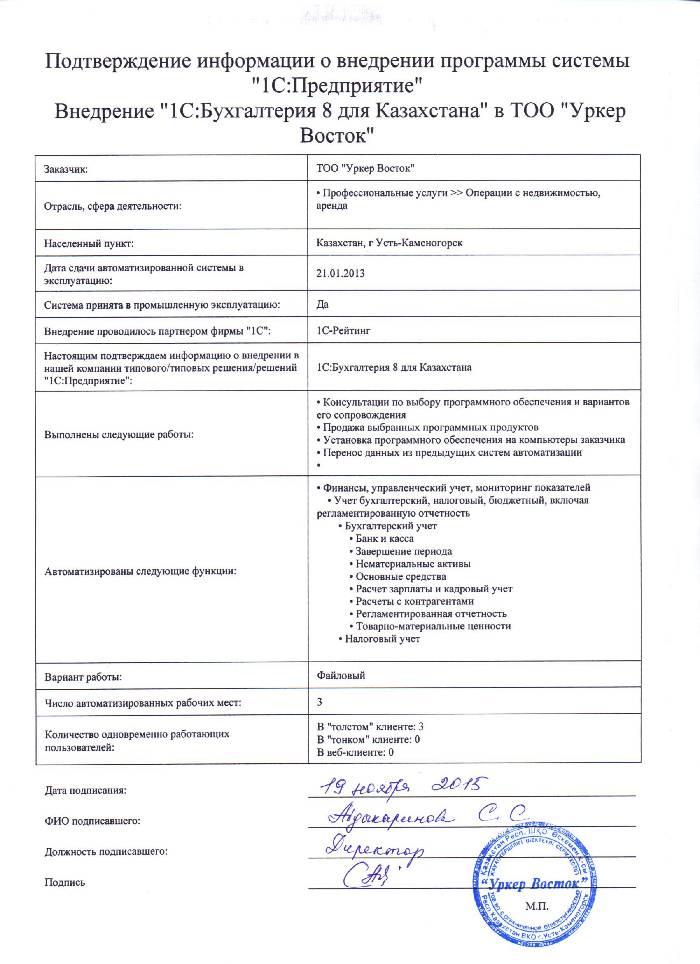 | Внедренное типовое решение: | 1С:Бухгалтерия 8 для Казахстана |