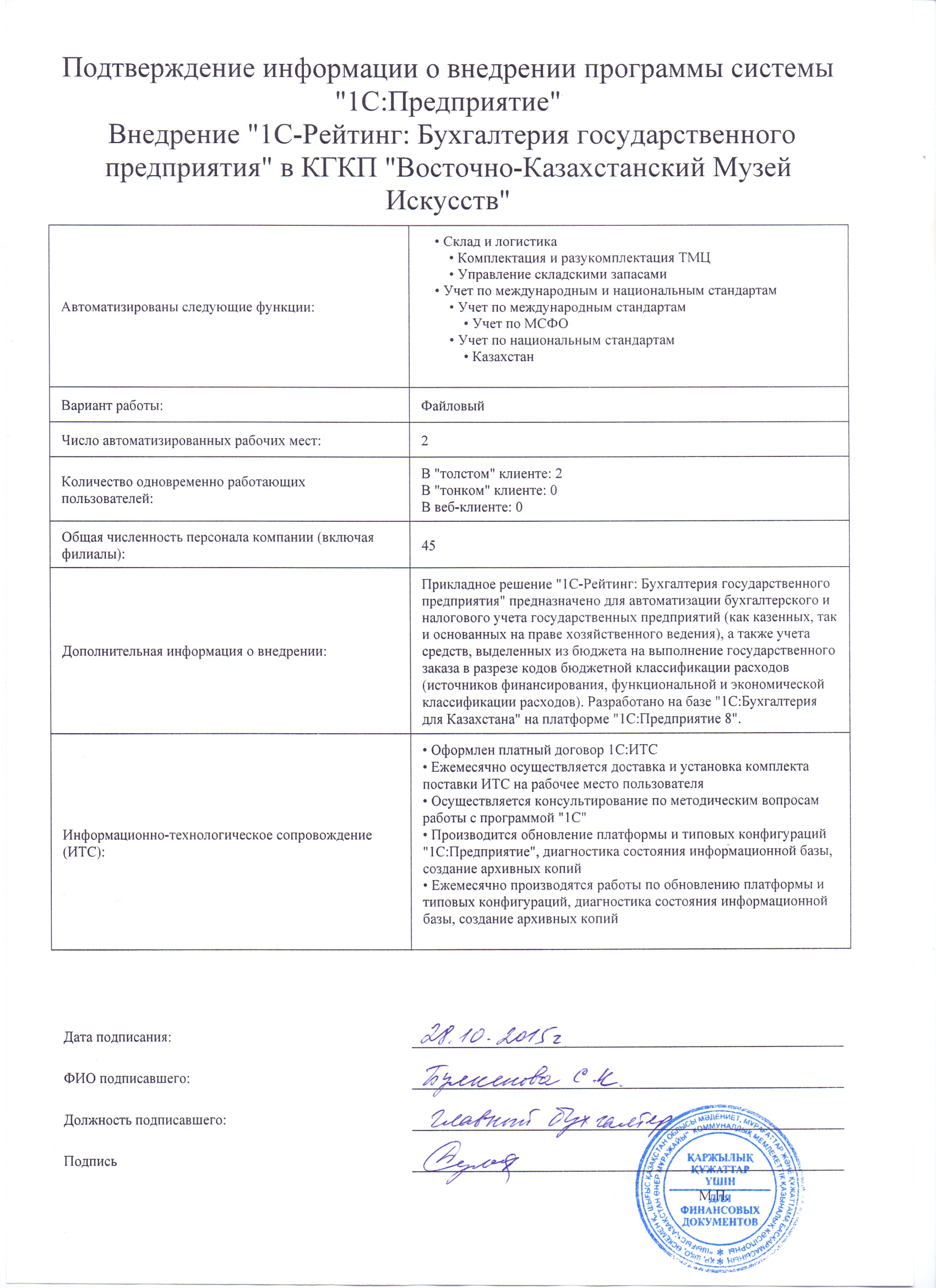 | Внедренное отраслевое решение: | 1С-Рейтинг: Бухгалтерия государственного предприятия |