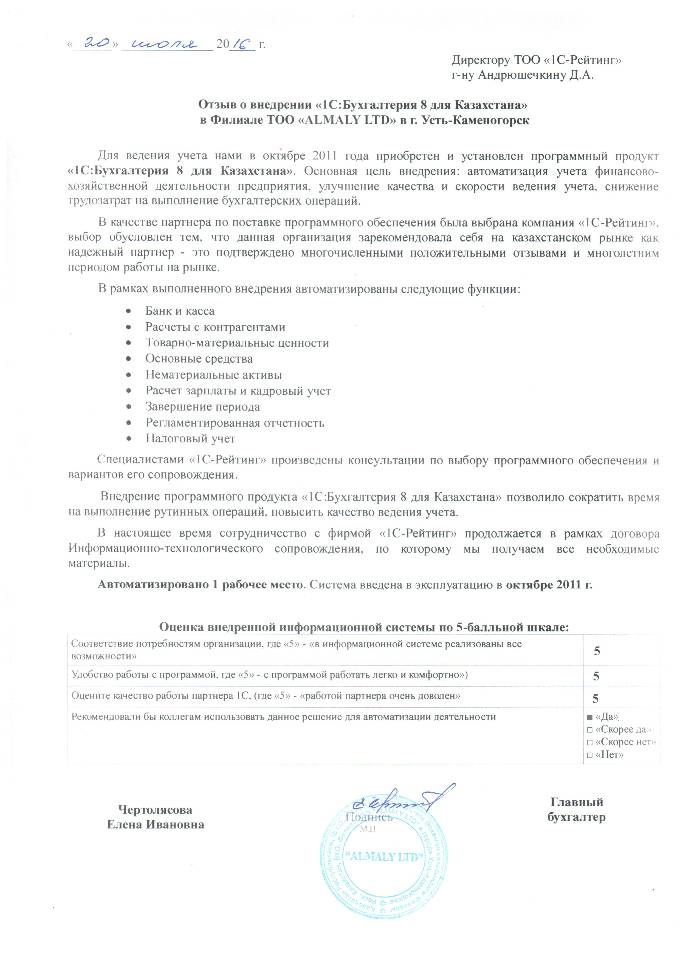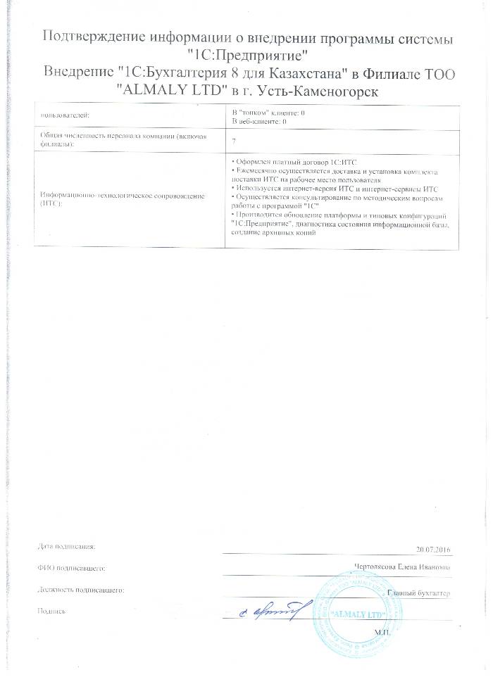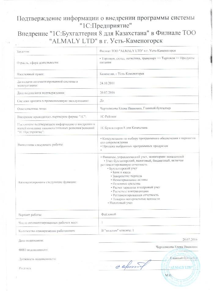 | Внедренное типовое решение: | 1С:Бухгалтерия 8 для Казахстана |