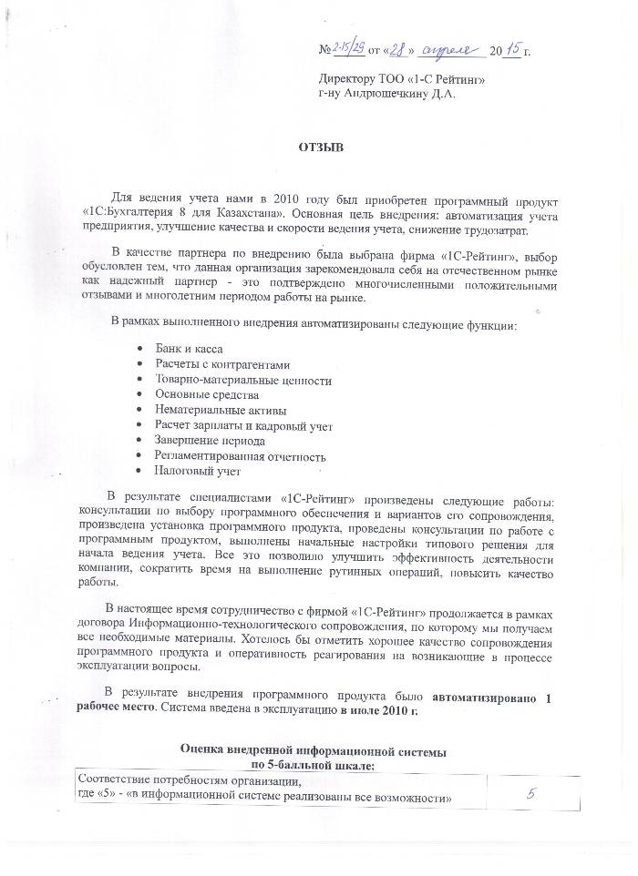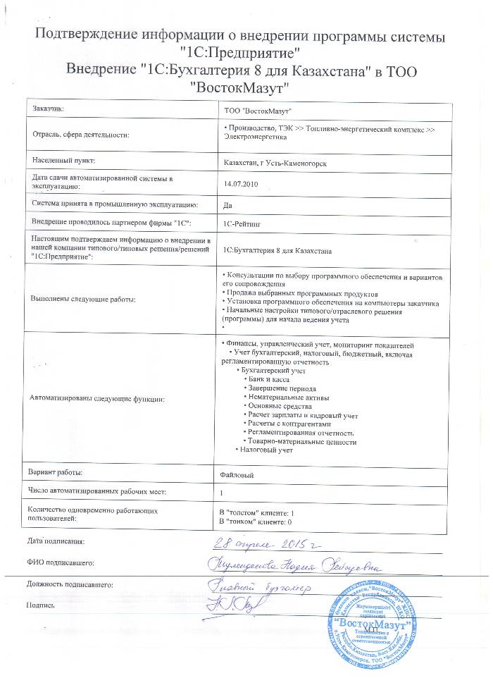 | Внедренное типовое решение: | 1С:Бухгалтерия 8 для Казахстана |