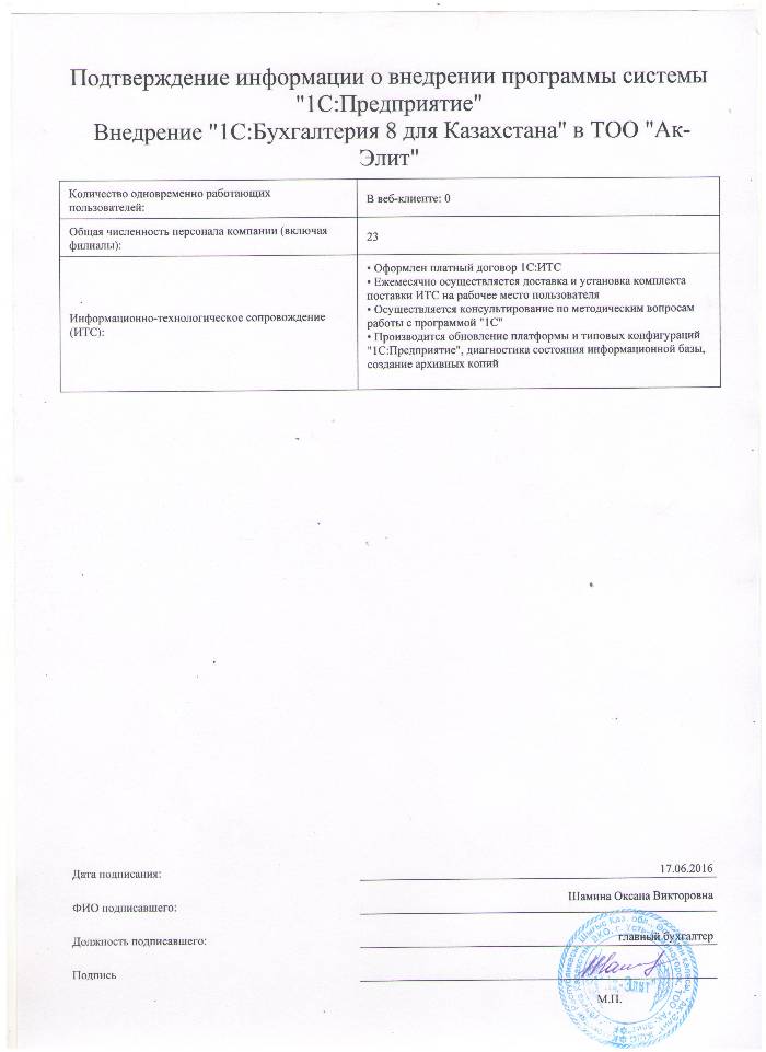 | Внедренное типовое решение: | 1С:Бухгалтерия 8 для Казахстана |
