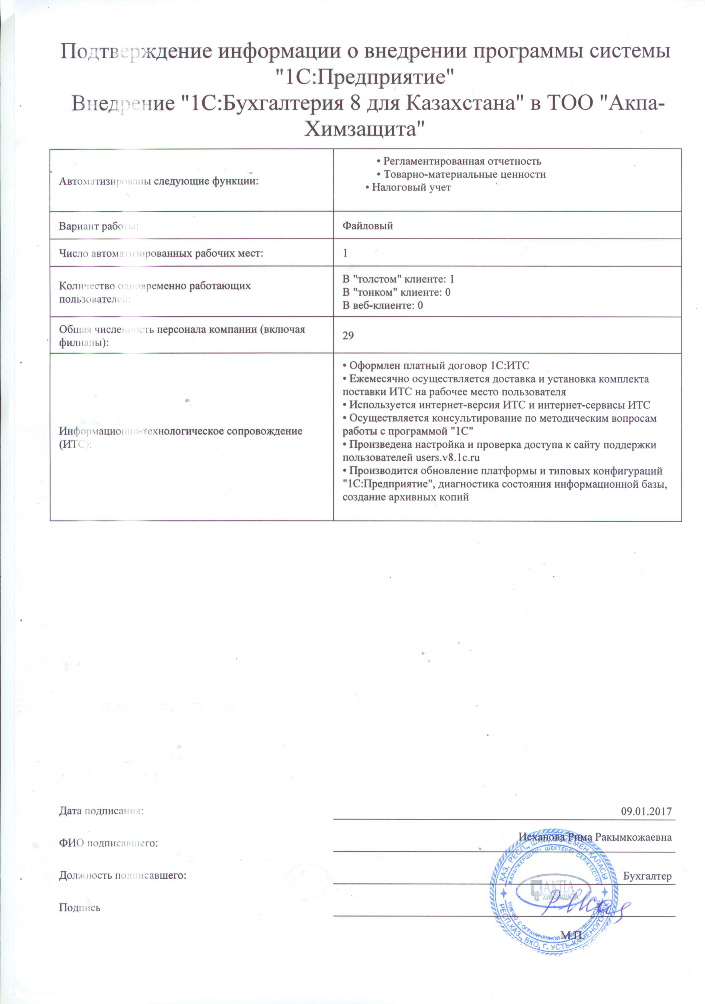 | Внедренное типовое решение: | 1С:Бухгалтерия 8 для Казахстана |