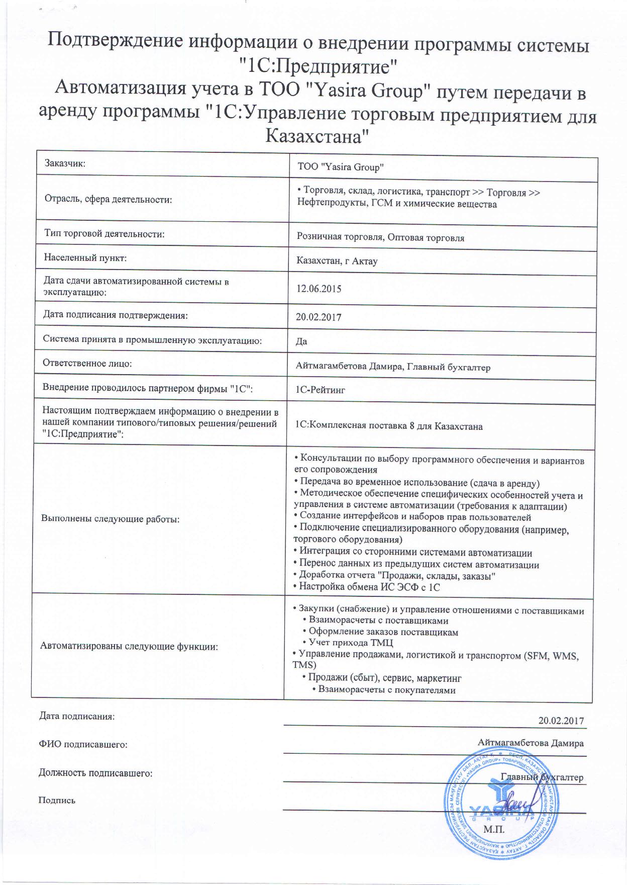 | Арендованное типовое решение: | 1С:Управление торговым предприятием для Казахстана |