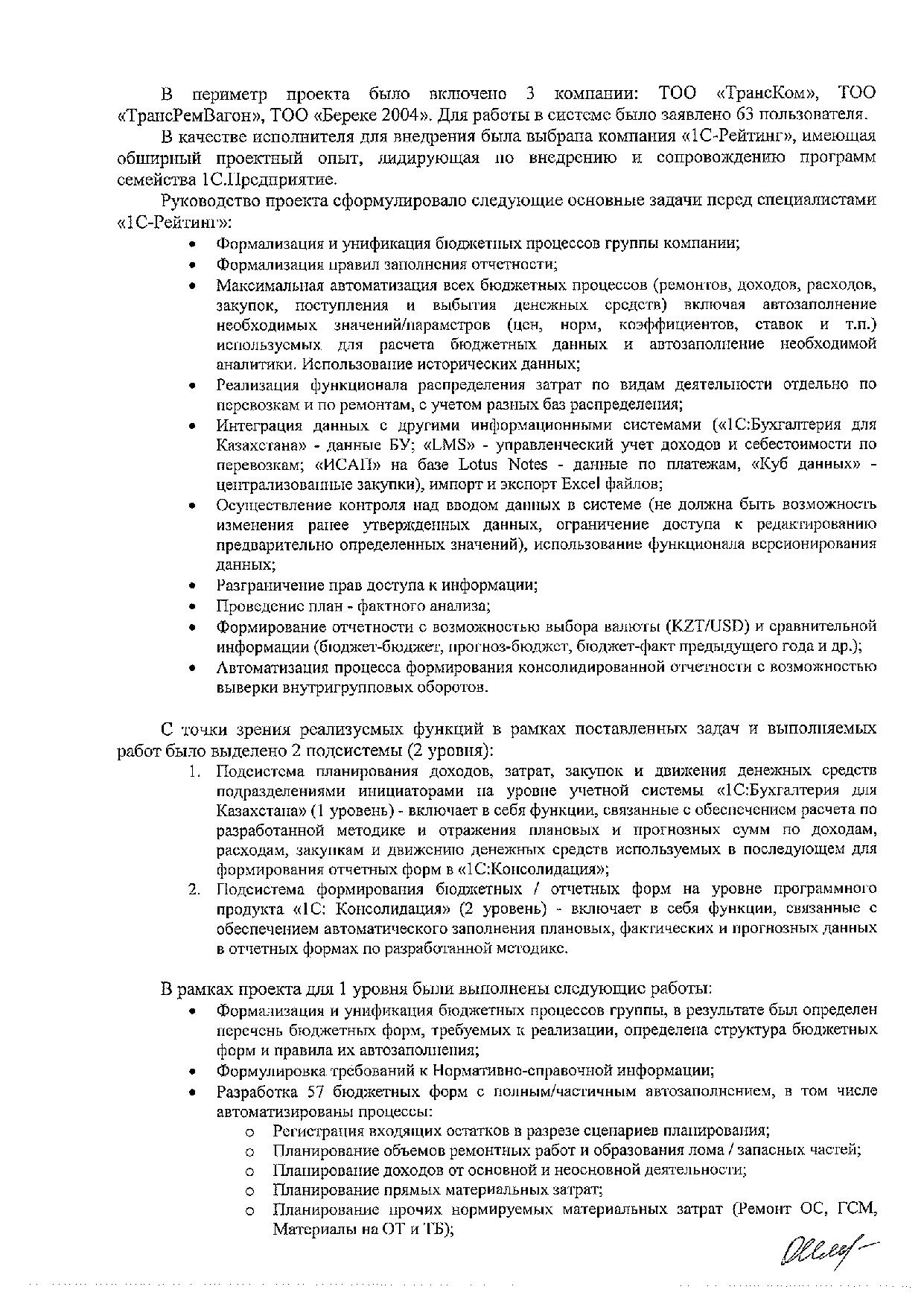 В периметр проекта было включено 3 компании: ТОО «ТрансКом», ТОО «ТрансРемВагон», ТОО «Береке 2004». Для работы в системе было заявлено 63 пользователя.