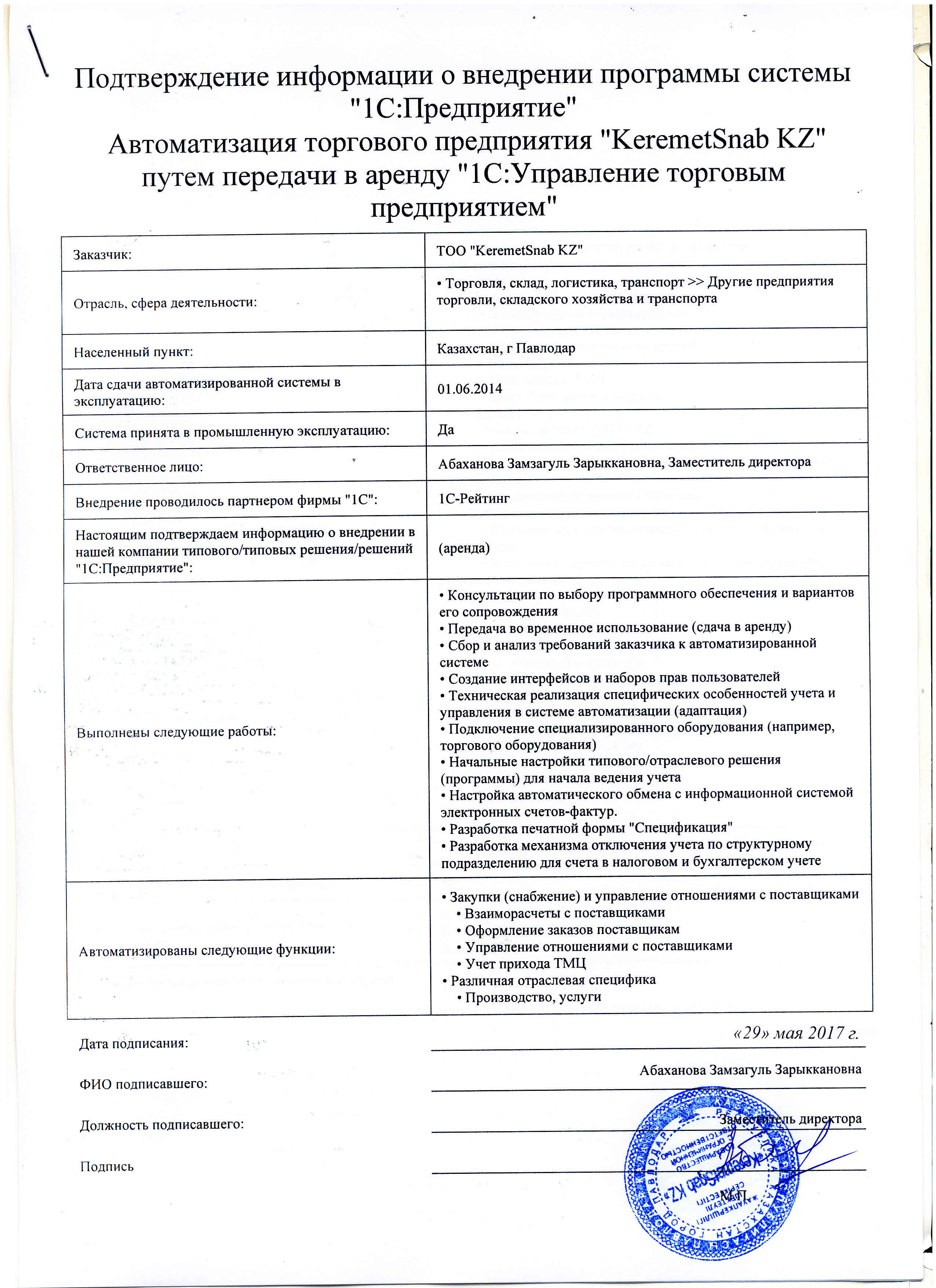 | Арендованное типовое решение: | 1С:Управление торговым предприятием для Казахстана |