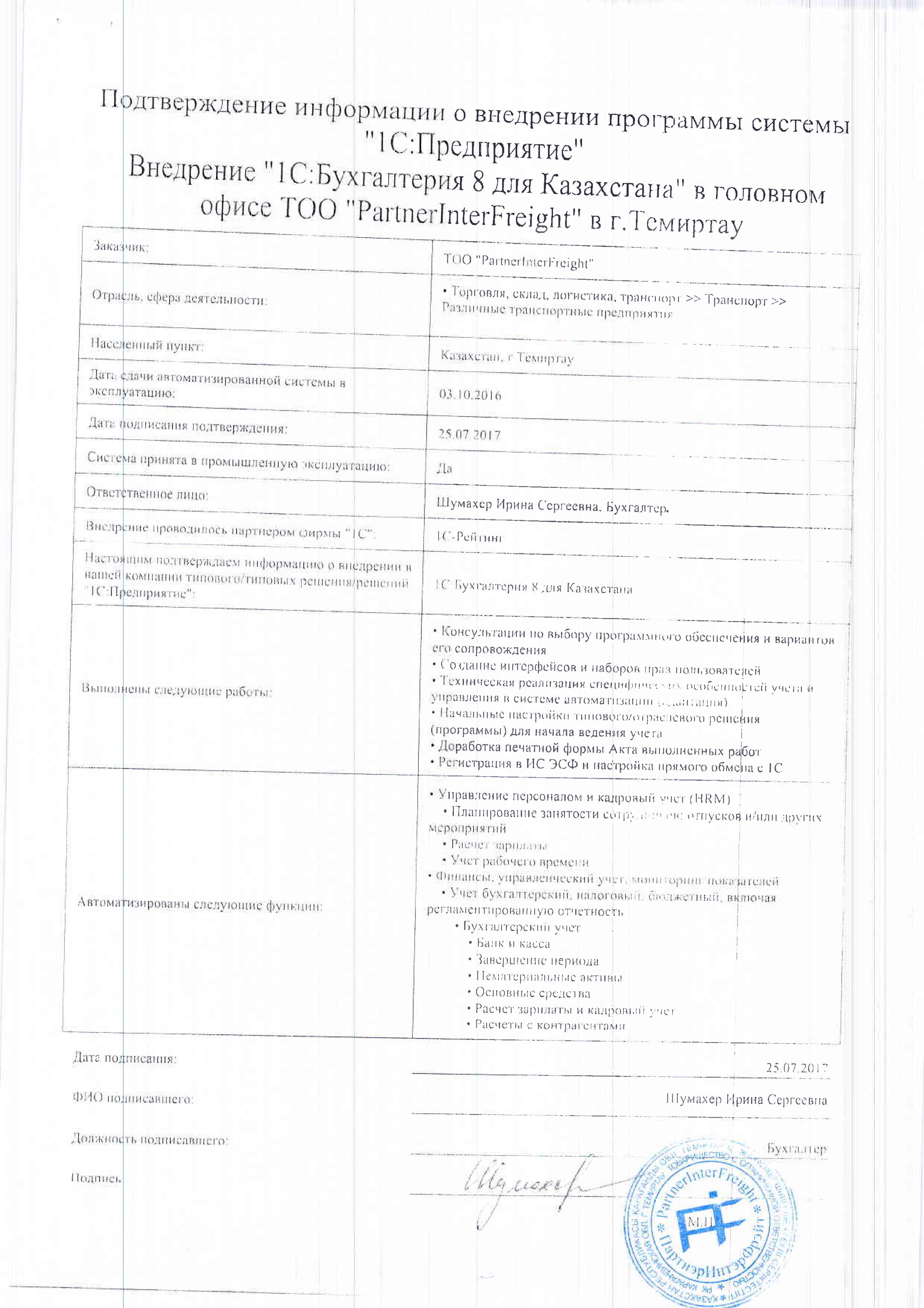 | Внедренное типовое решение: | 1С:Бухгалтерия 8 для Казахстана |