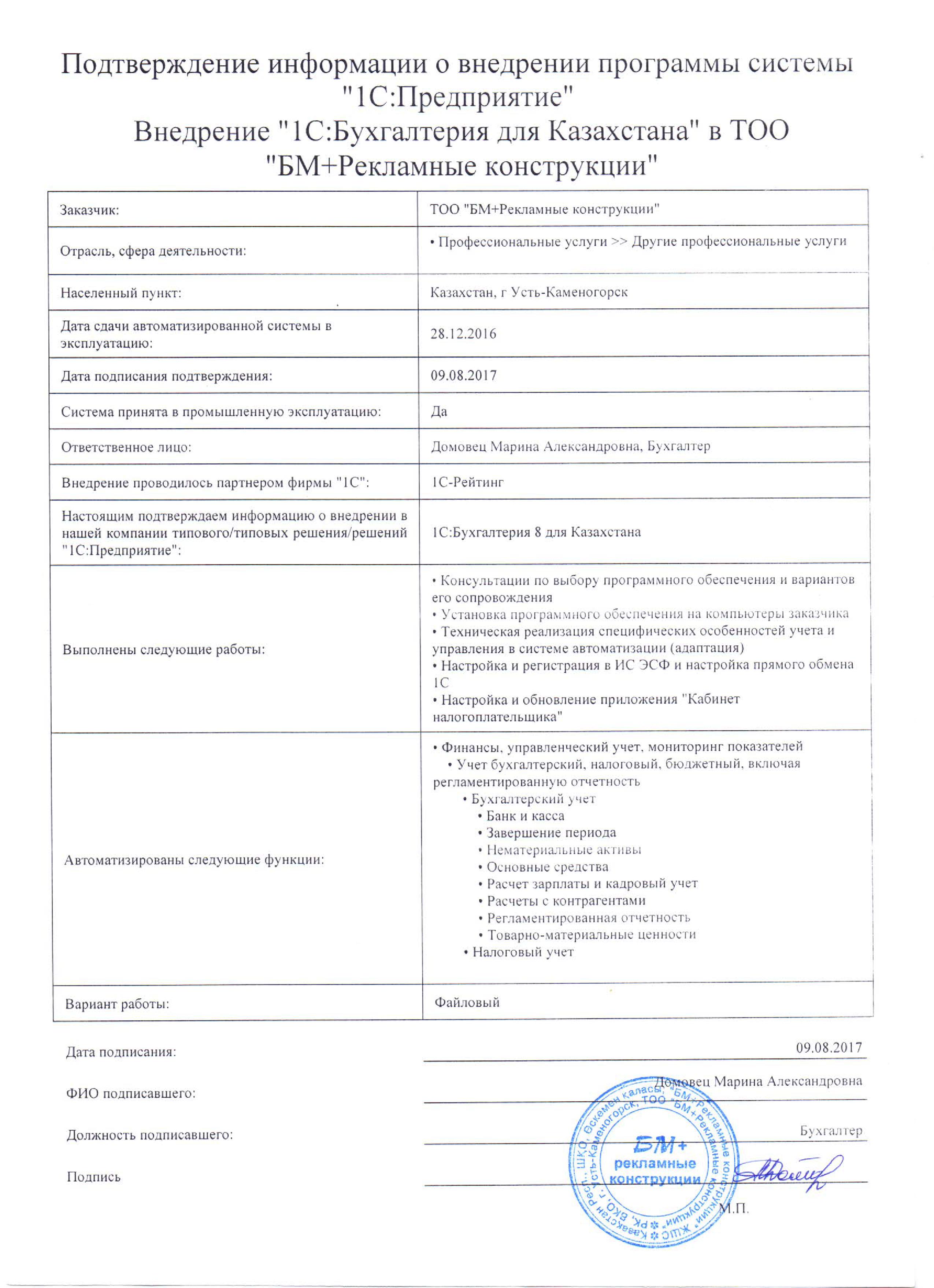 | Внедренное типовое решение: | 1С:Бухгалтерия 8 для Казахстана |
