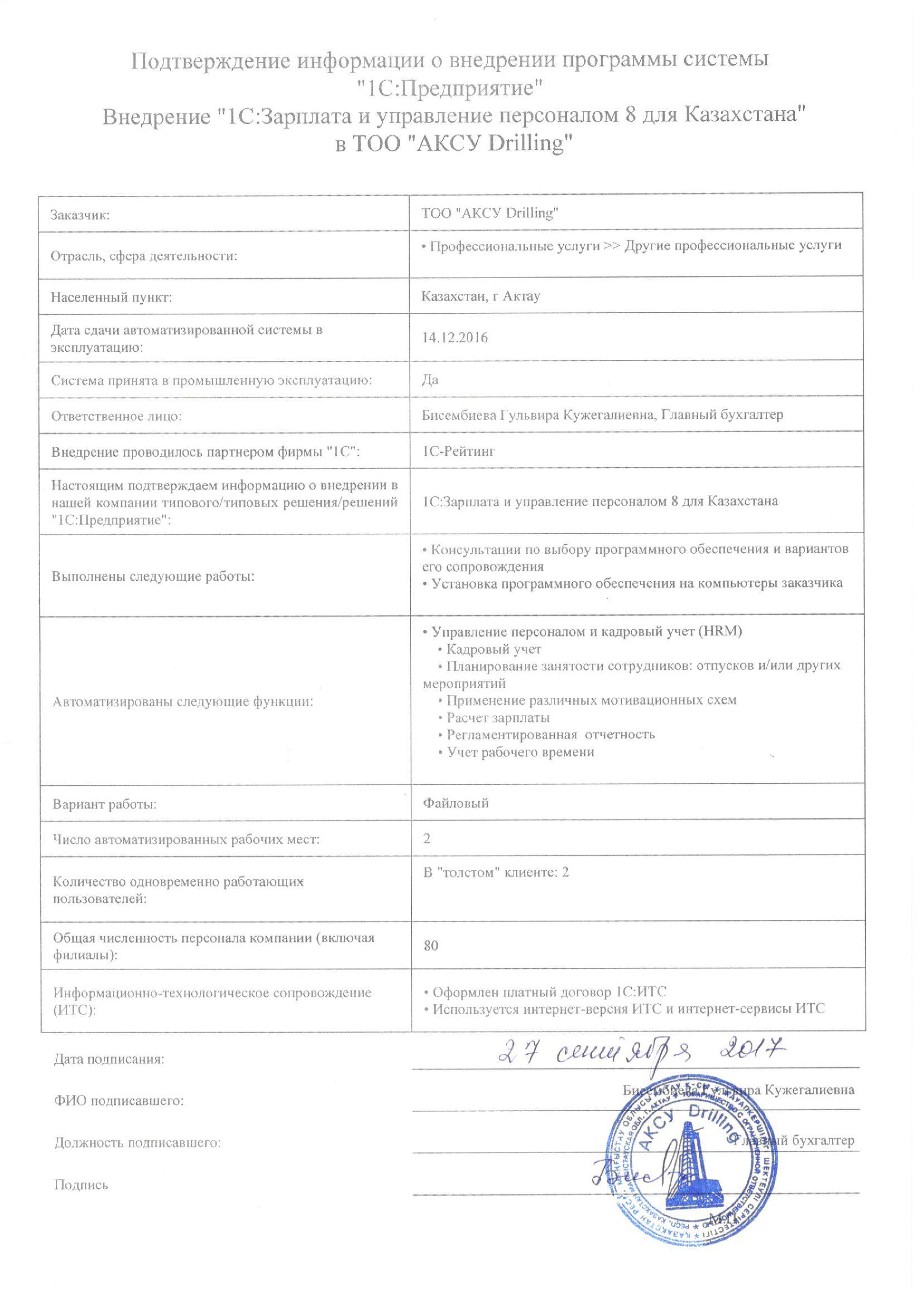 | Внедренное типовое решение: | 1С:Зарплата и управление персоналом 8 для Казахстана |