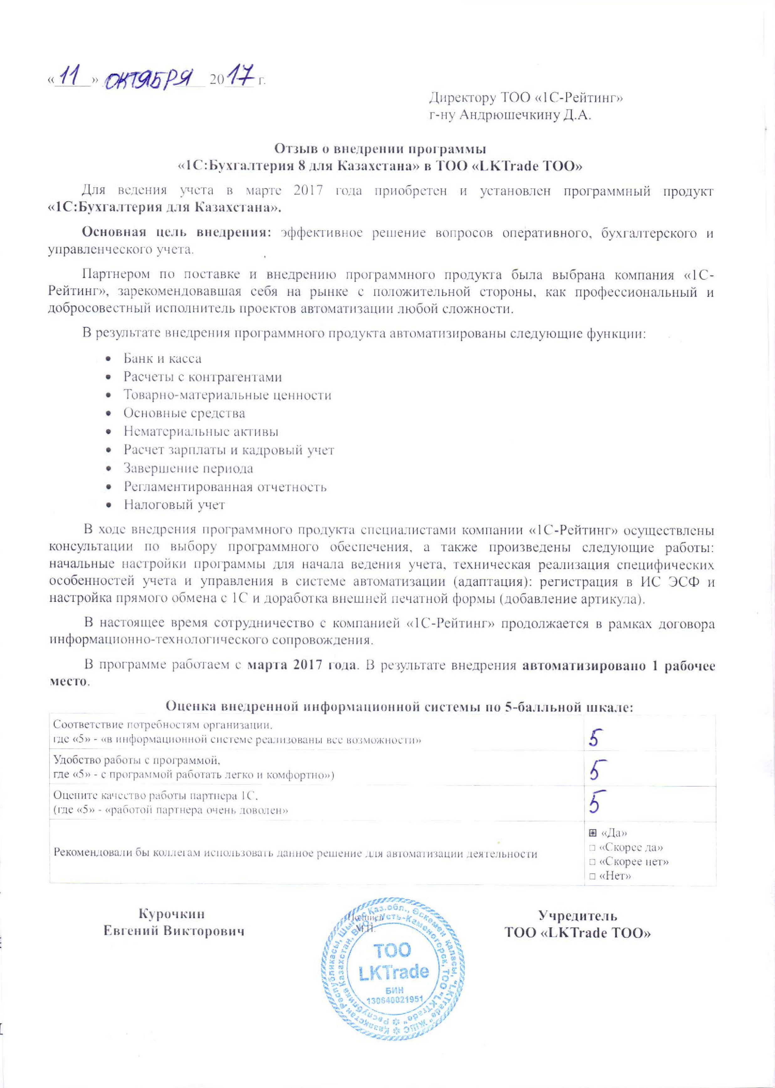 | Внедренное типовое решение: | 1С:Бухгалтерия 8 для Казахстана |