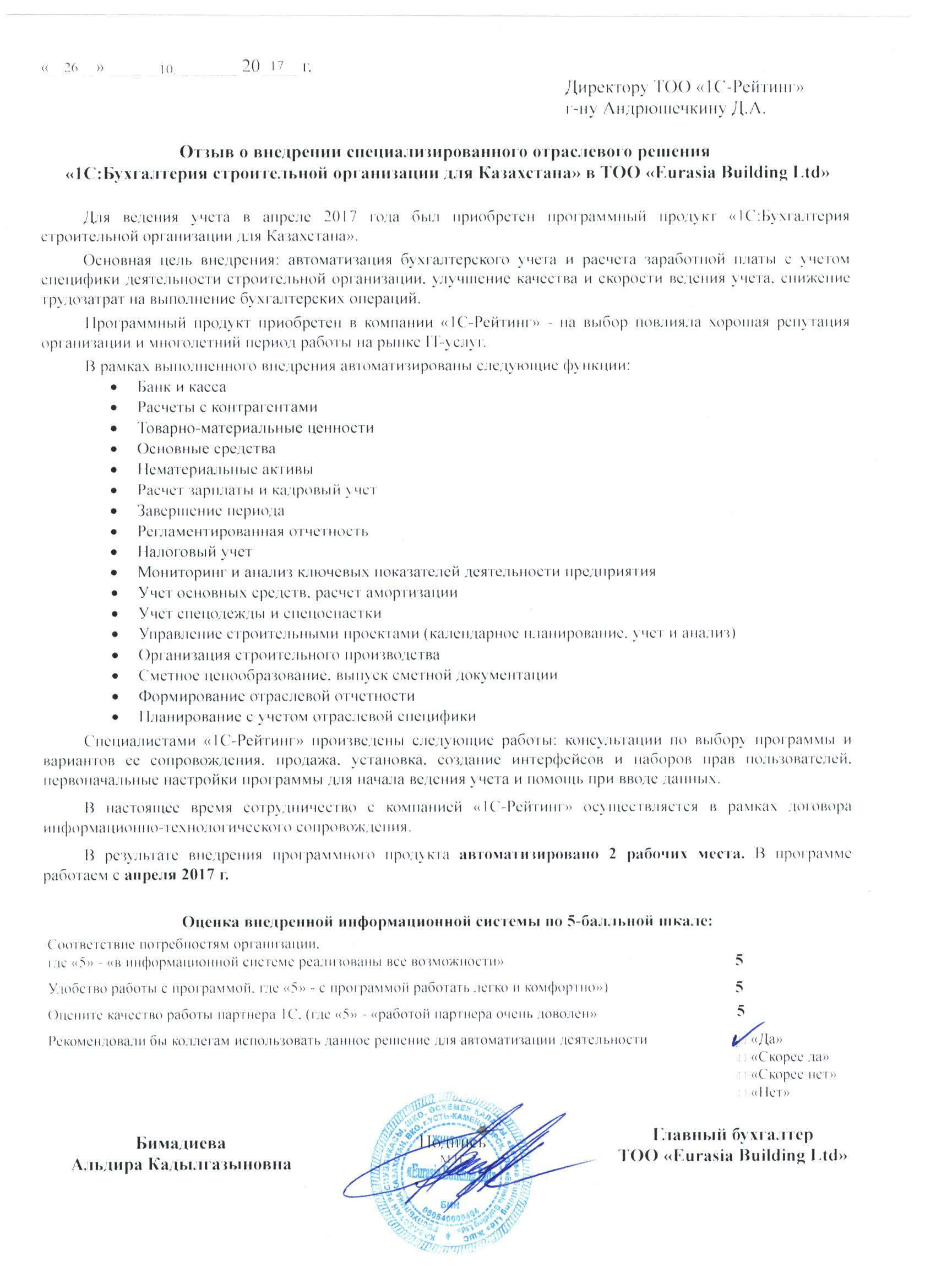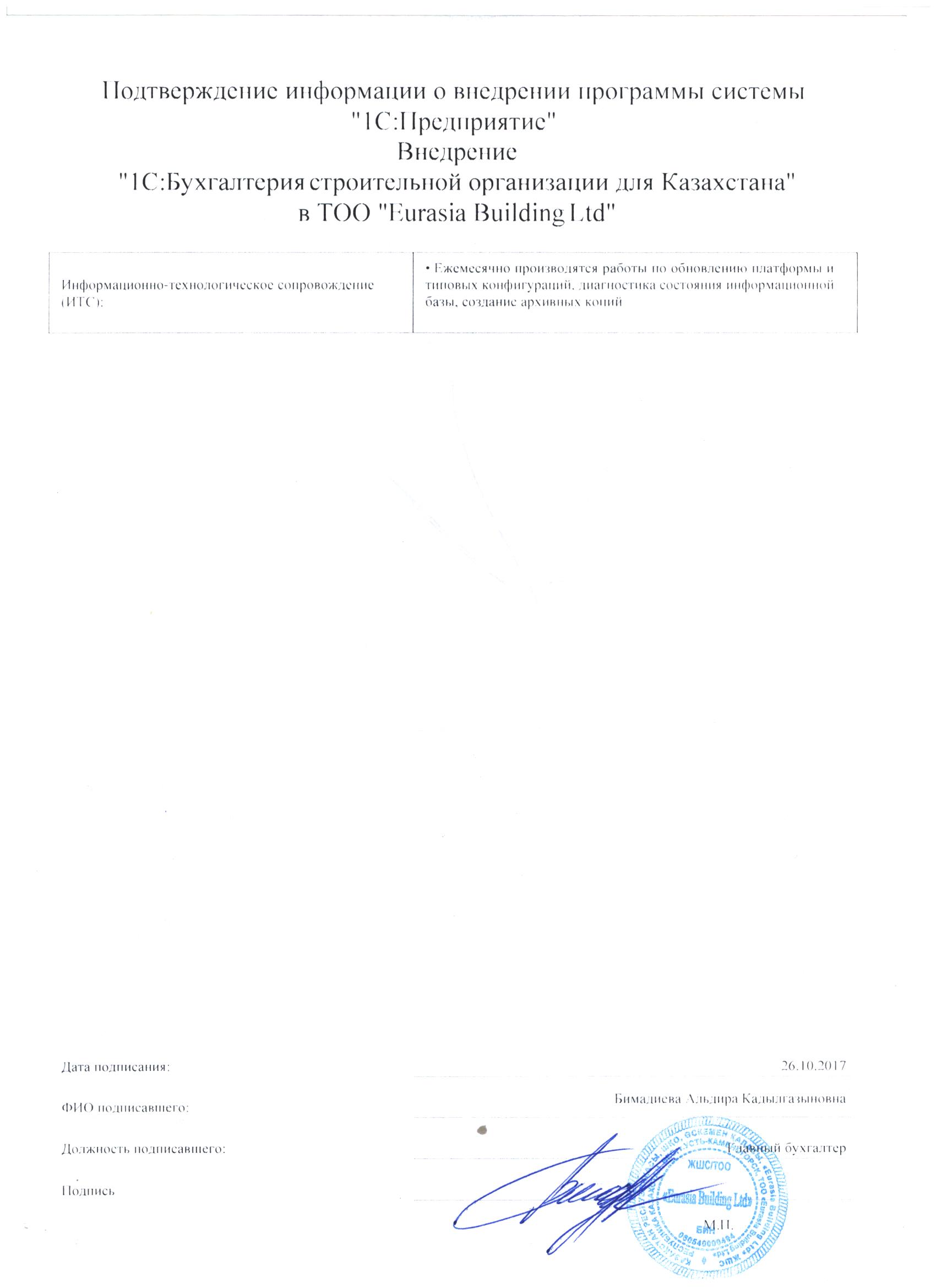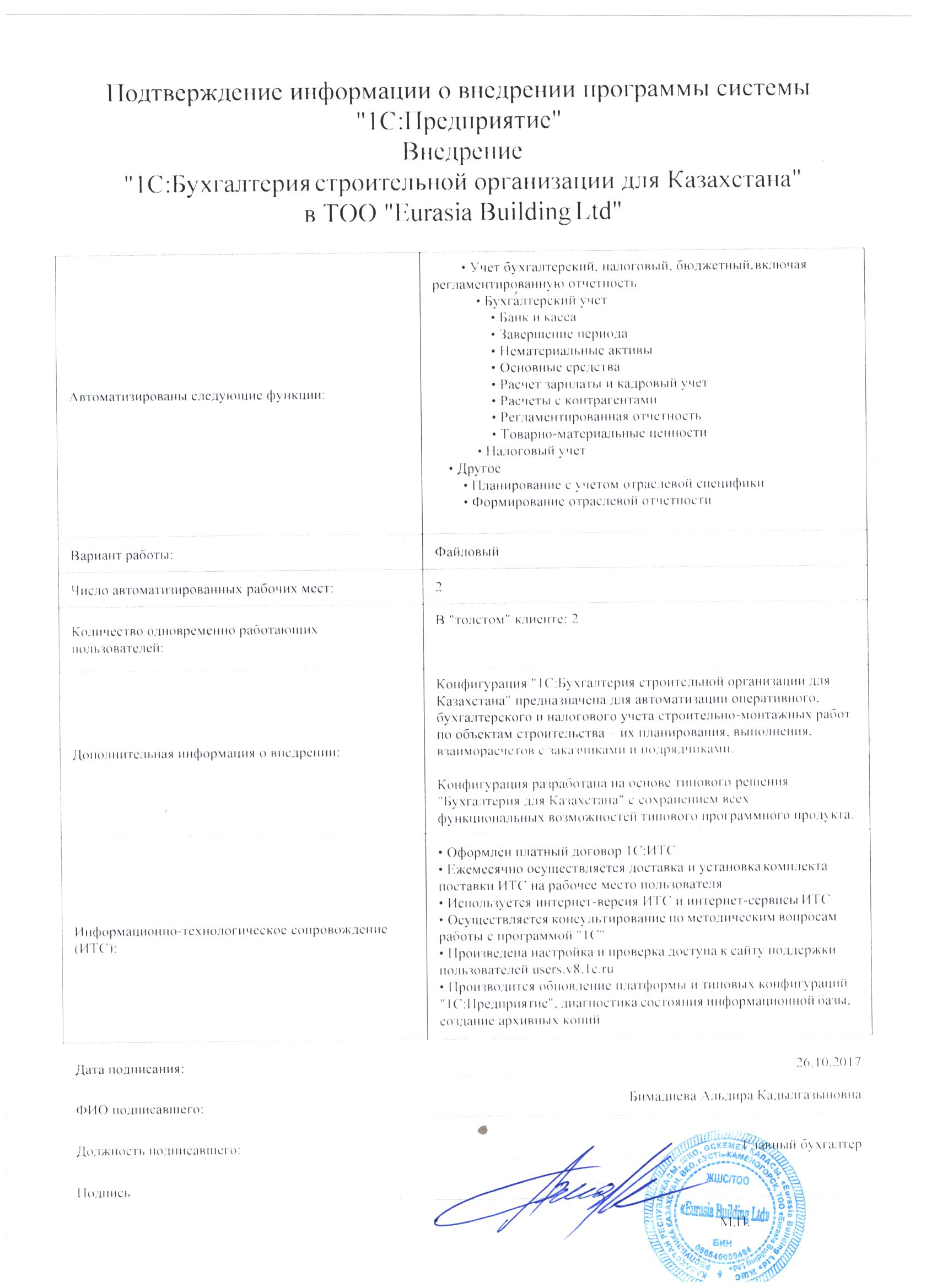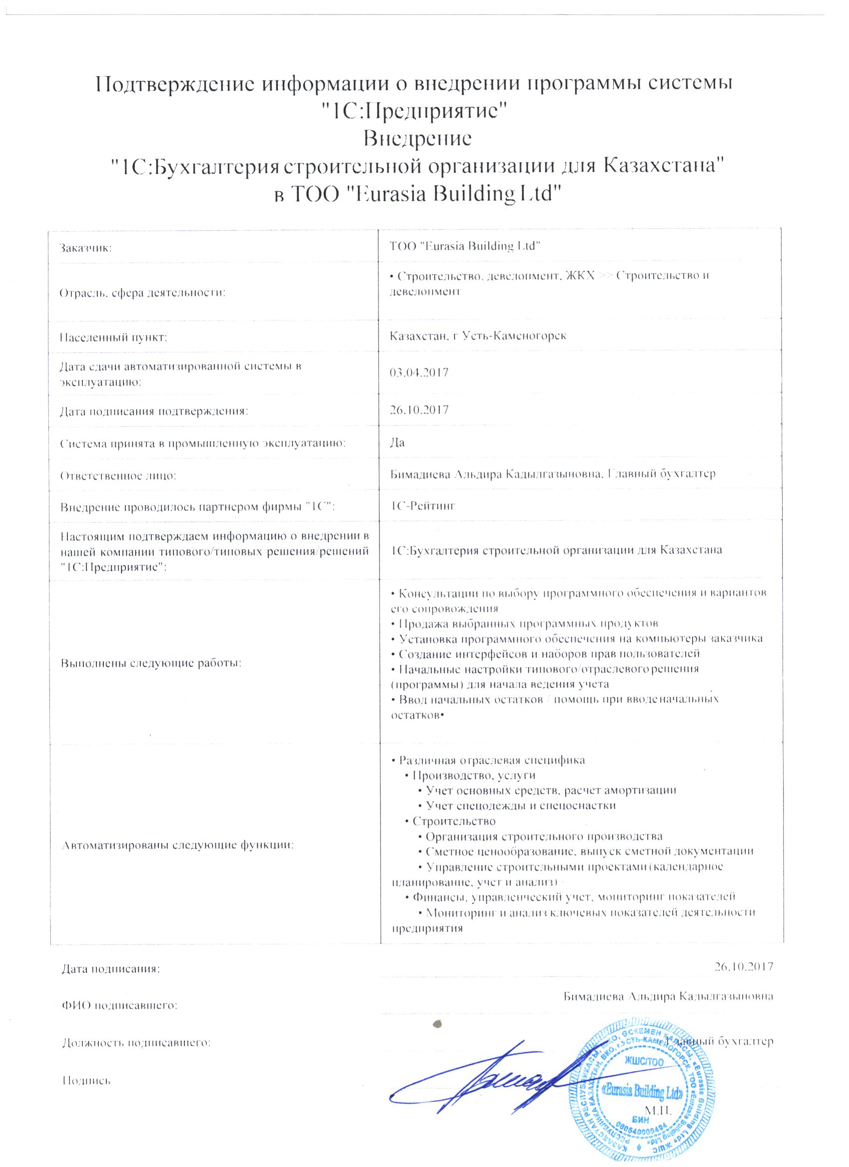 Внедрение «1С:Бухгалтерия строительной организации для Казахстана» в ТОО «Eurasia Building Ltd»