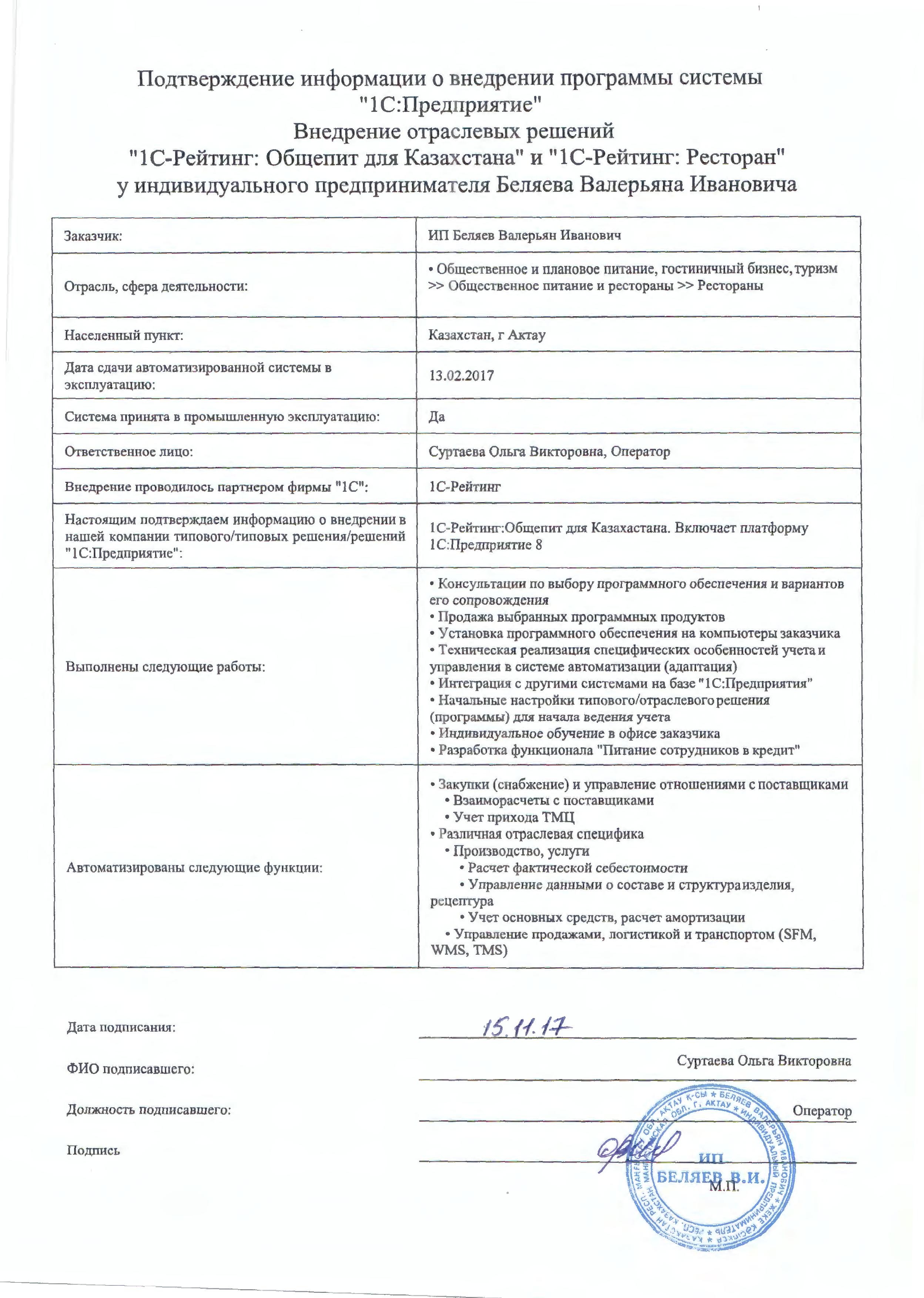 - Ежемесячно производятся работы по обновлению платформы и типовых конфигураций, диагностика состояния информационной базы, создание архивных копий