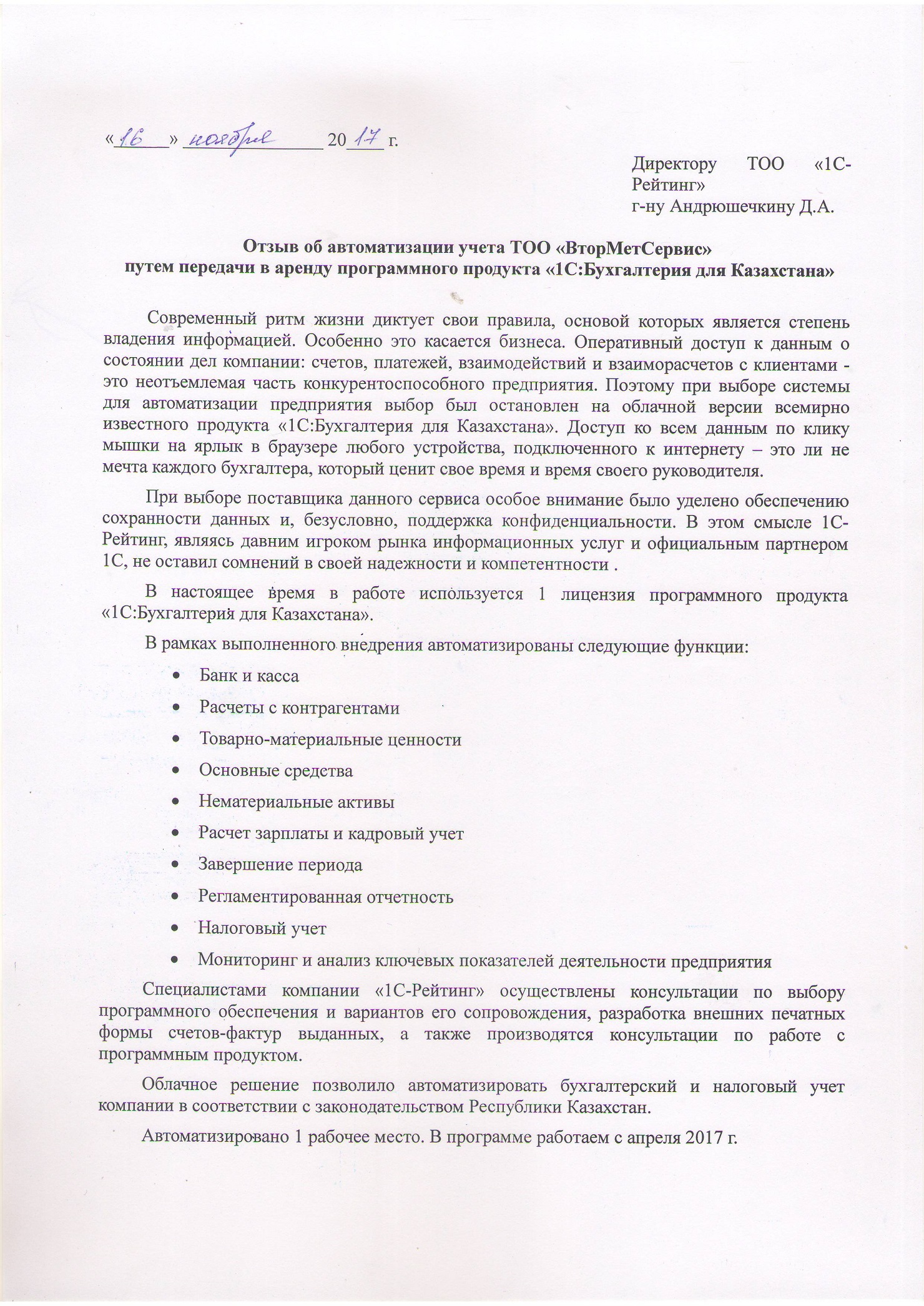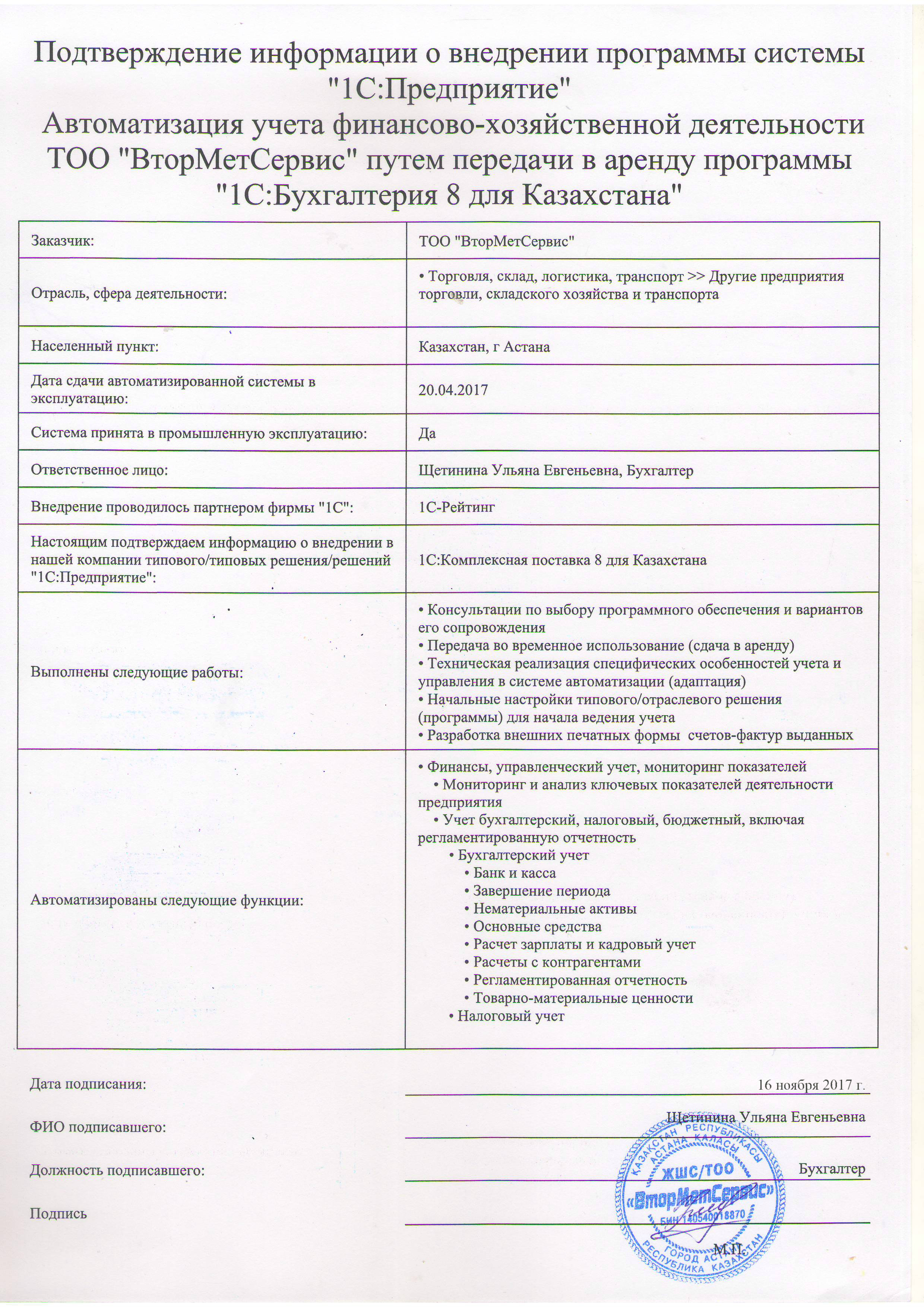 Автоматизация учета финансово-хозяйственной деятельности ТОО «ВторМетСервис» путем передачи в аренду программы «1С:Бухгалтерия для Казахстана»