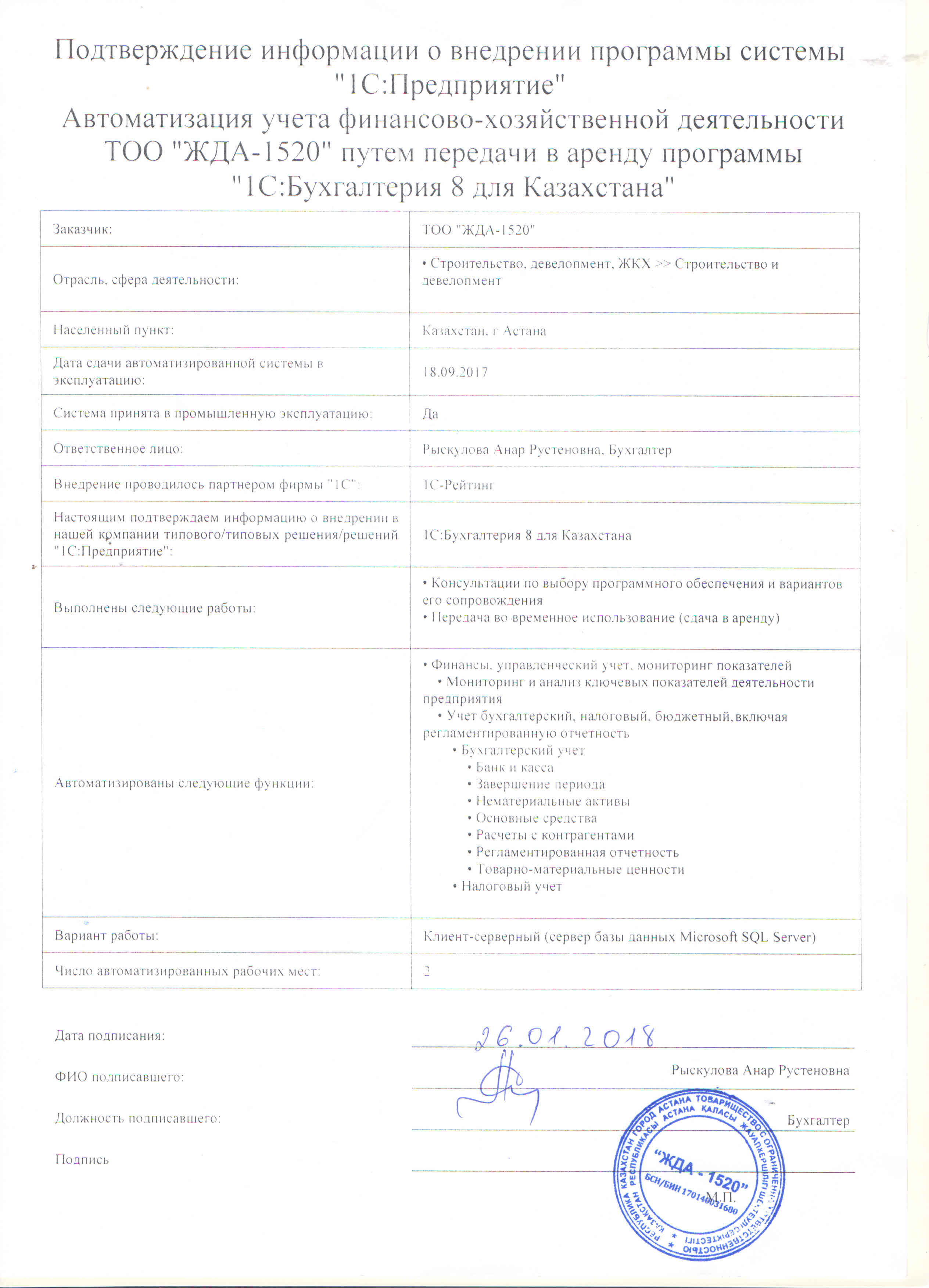 | Арендованное типовое решение: | 1С:Бухгалтерия для Казахстана |