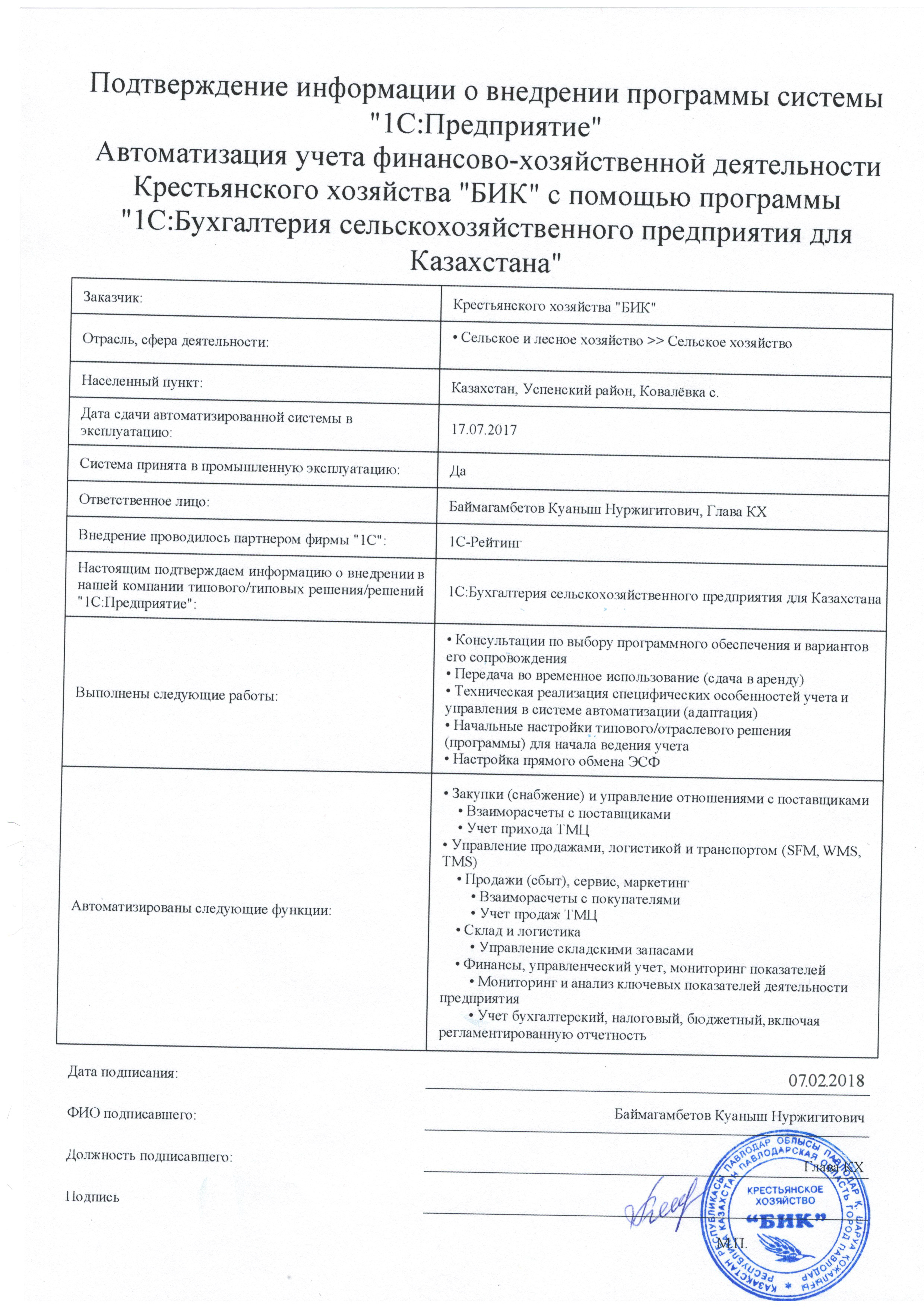 | Арендованное отраслевое решение: | 1С:Бухгалтерия сельскохозяйственного предприятия для Казахстана |