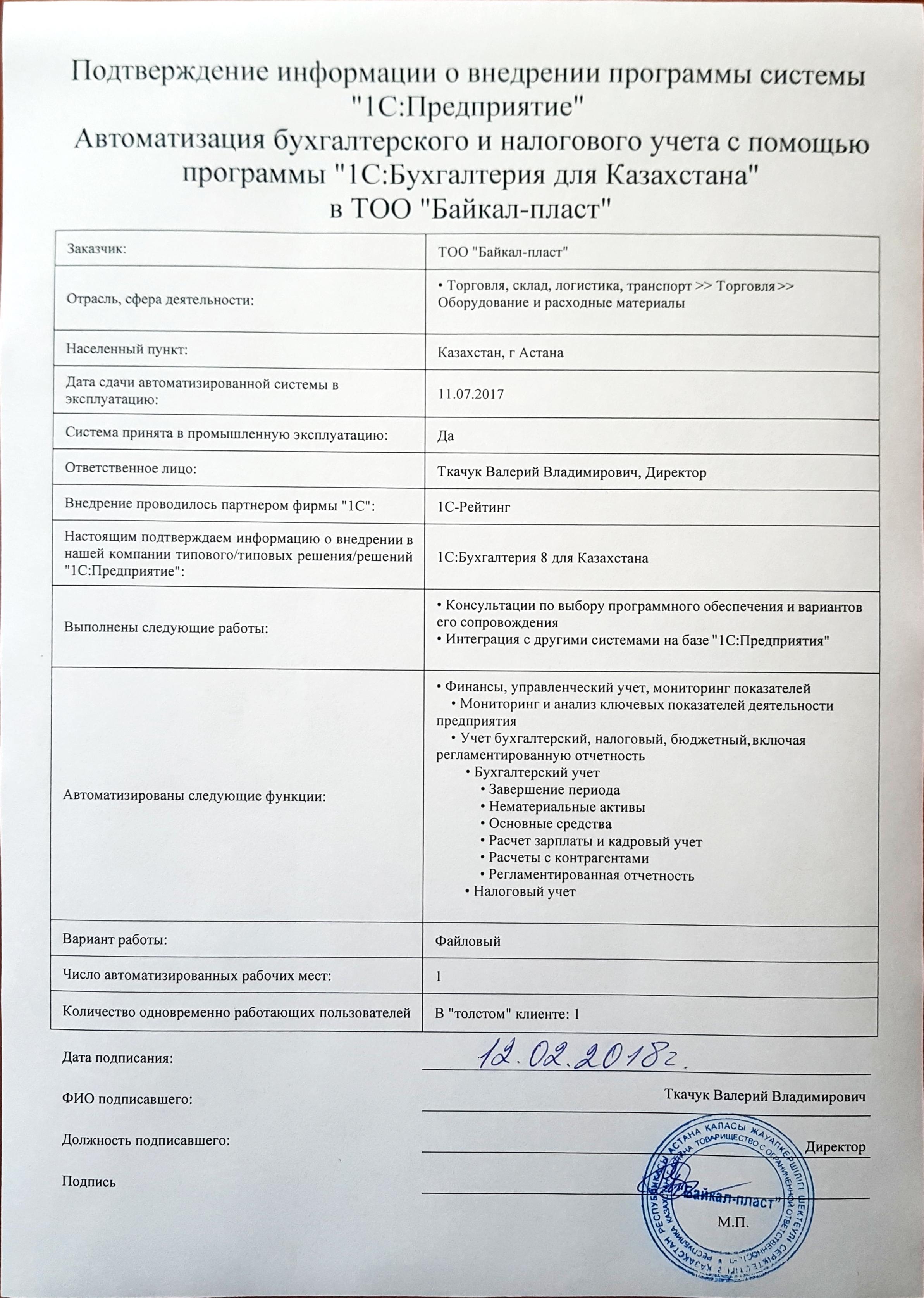| Внедренное типовое решение: | 1С:Бухгалтерия для Казахстана